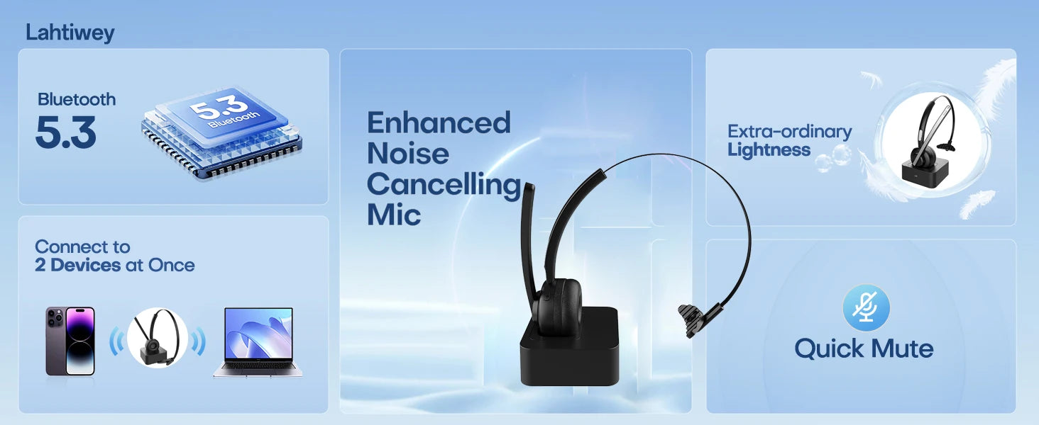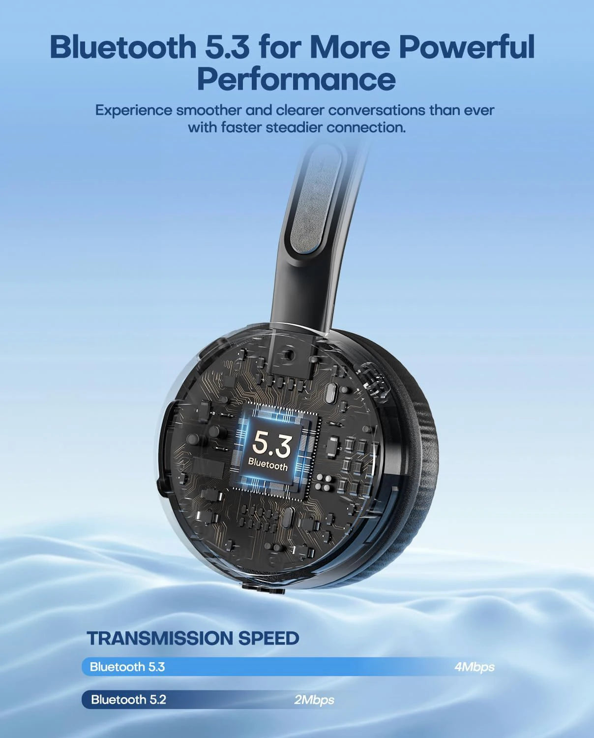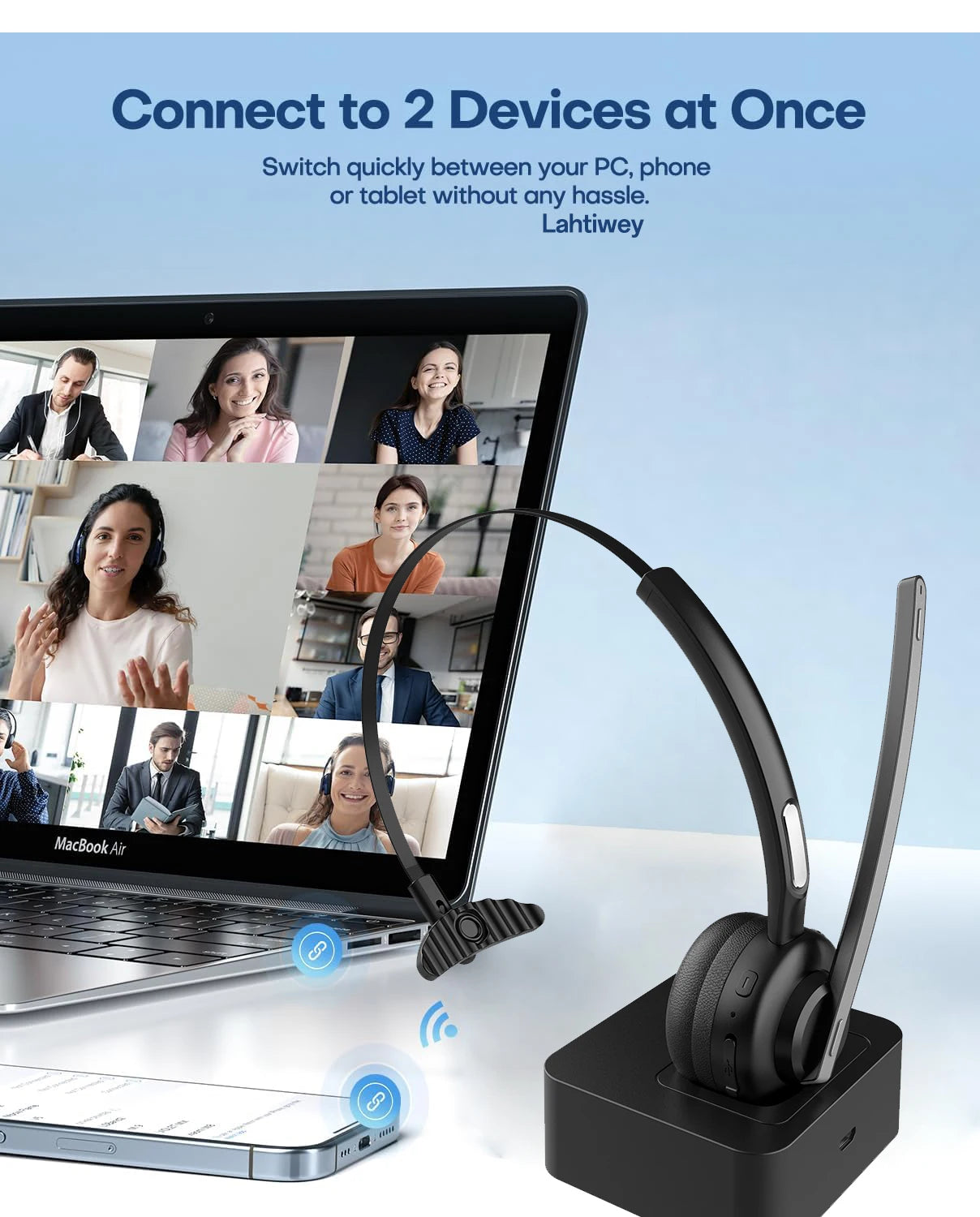 سماعة بلوتوث، سماعة رأس لاسلكية مع ميكروفون للعمل، سماعة رأس للكمبيوتر مع ميكروفون، سماعة رأس خفيفة الوزن بتقنية بلوتوث V5.3 مع ميكروفون عازل للضوضاء، وزر كتم الصوت، ونقاط متعددة، وقاعدة شحن