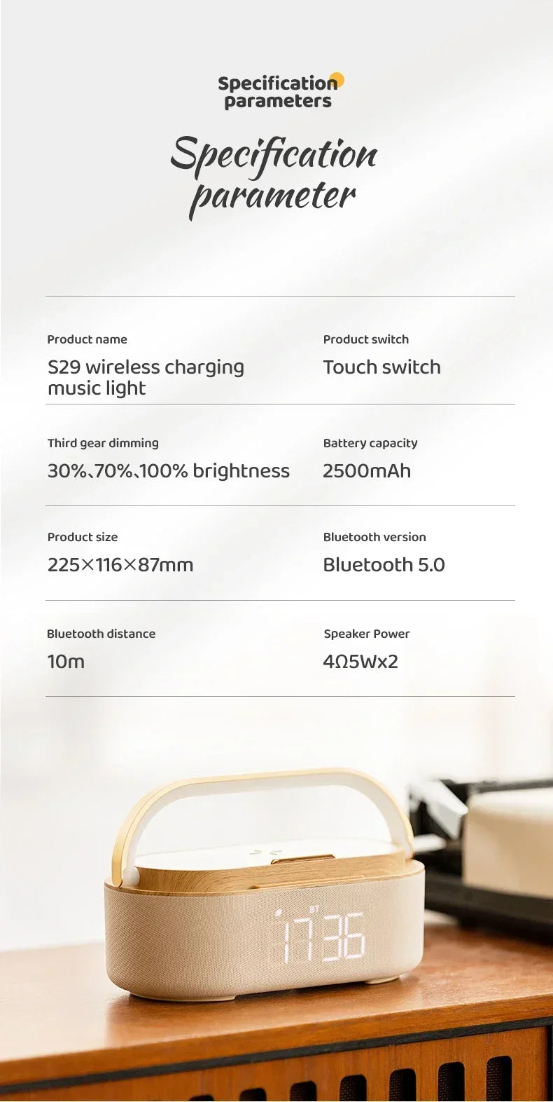 مكبر صوت بلوتوث COSLUR S29، بطارية 2500 مللي أمبير، يدعم الشحن اللاسلكي بقوة 15 وات، شاشة عرض رقمية، ضوء ليلي، ساعة منبه