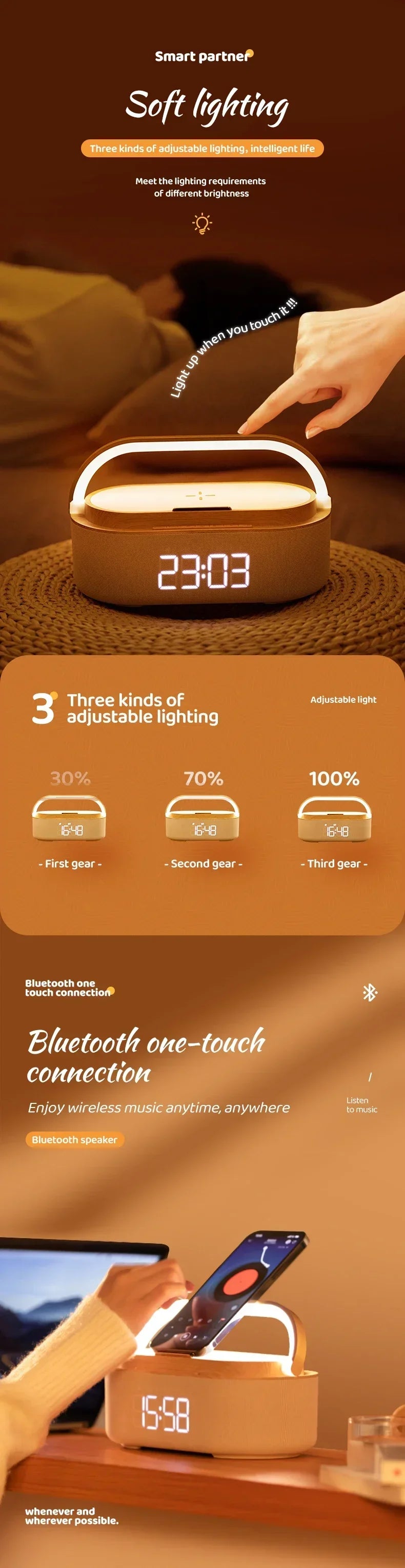تجمع ساعة المنبه بين مواد عالية الجودة وسطح أملس ومكبر صوت ملفوف بالقماش، مما يجعلها مثالية لأي مكان في غرفة النوم أو غرفة المعيشة أو على طاولة المطبخ. تصميمها الرائع سيُزين غرفة نومك بلا شك.