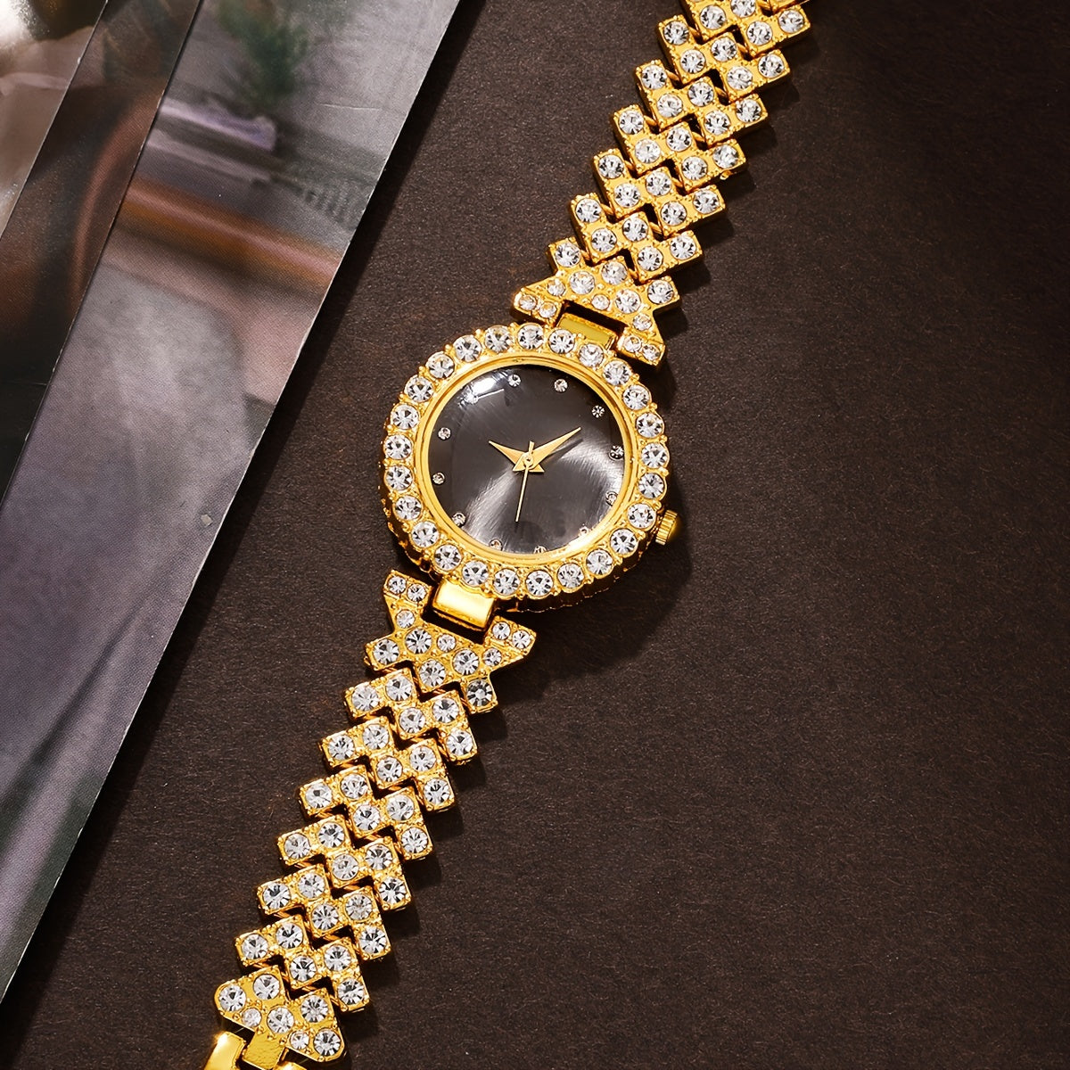 طقم أنيق من 5 قطع من الساعات والمجوهرات النسائية - ساعات كوارتز كلاسيكية بسوار من الجلد الصناعي مع لمسات من الكريستال، وعلبة من سبائك الزنك