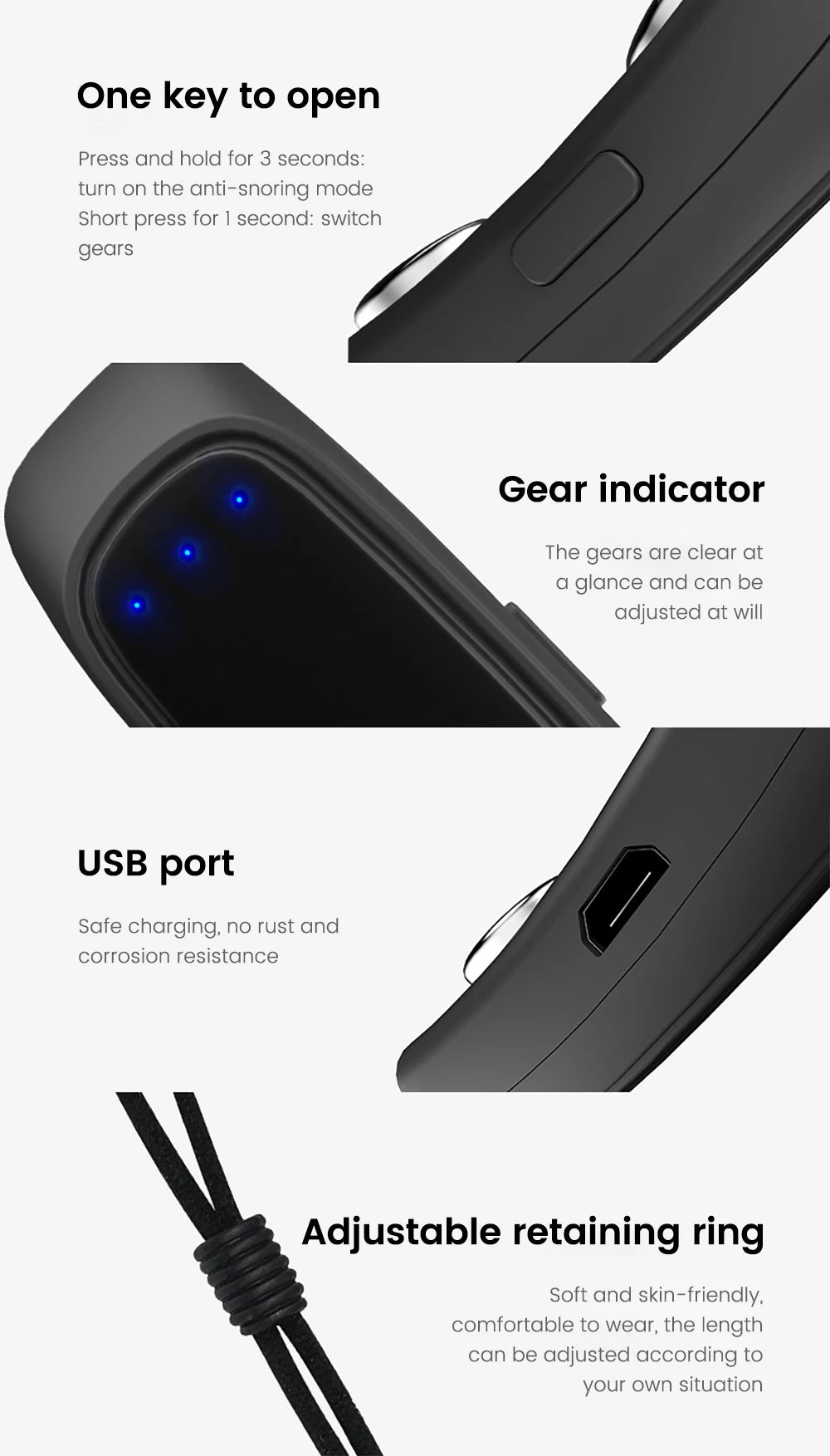 يكتشف المنتج الشخير تلقائيًا وبدقة من خلال أجهزة استشعار عالية الدقة، ويدلك العصب تحت اللسان وعضلات الفك بنبضات اهتزازية بترددات مختلفة لشد العضلات وضبط إيقاع التنفس. وجعل التنفس أكثر سلاسة.