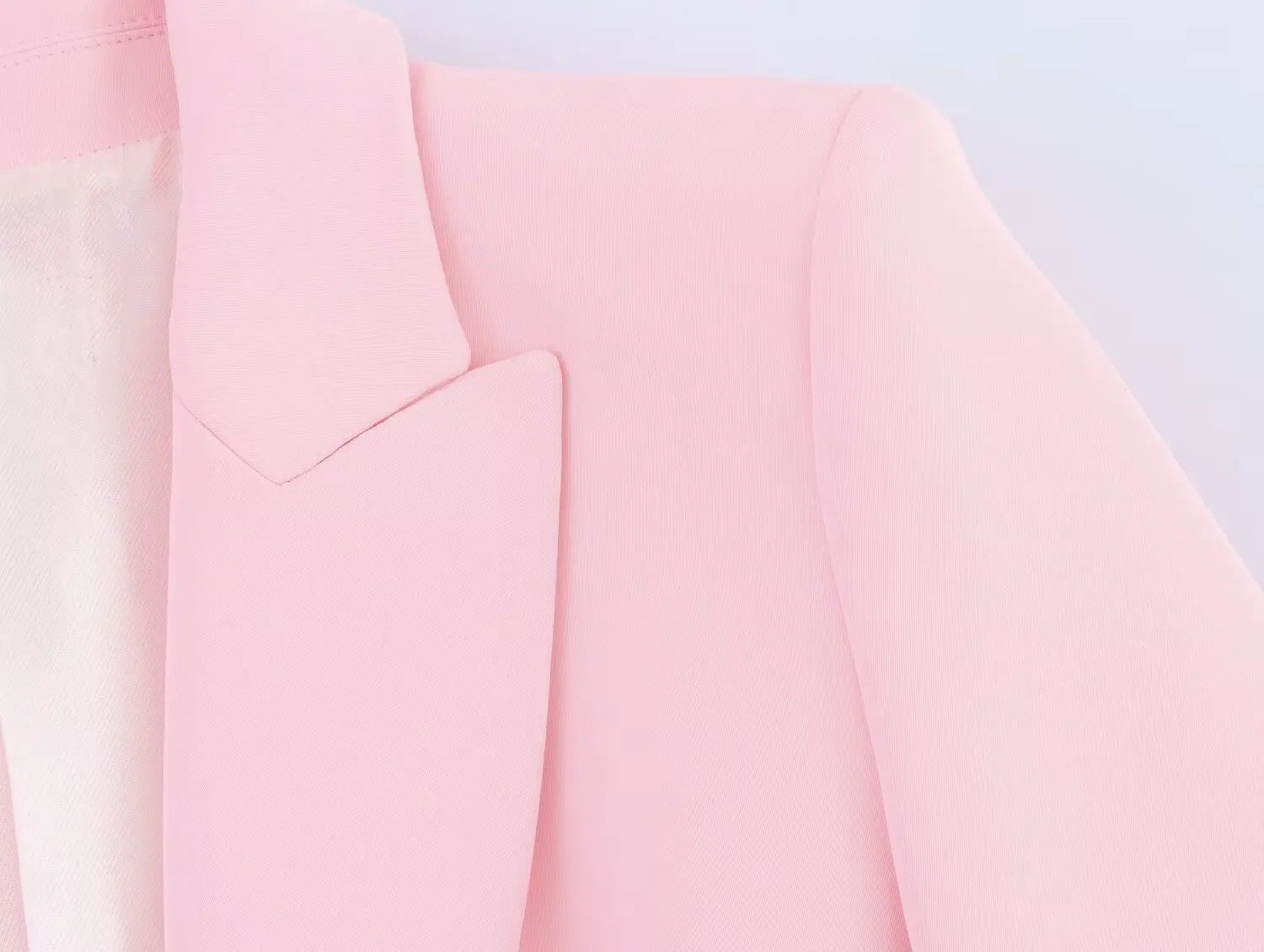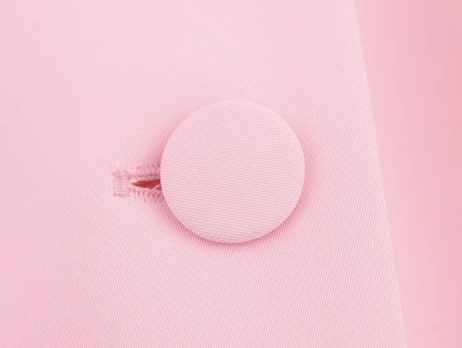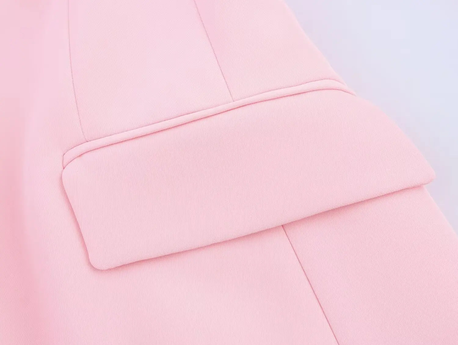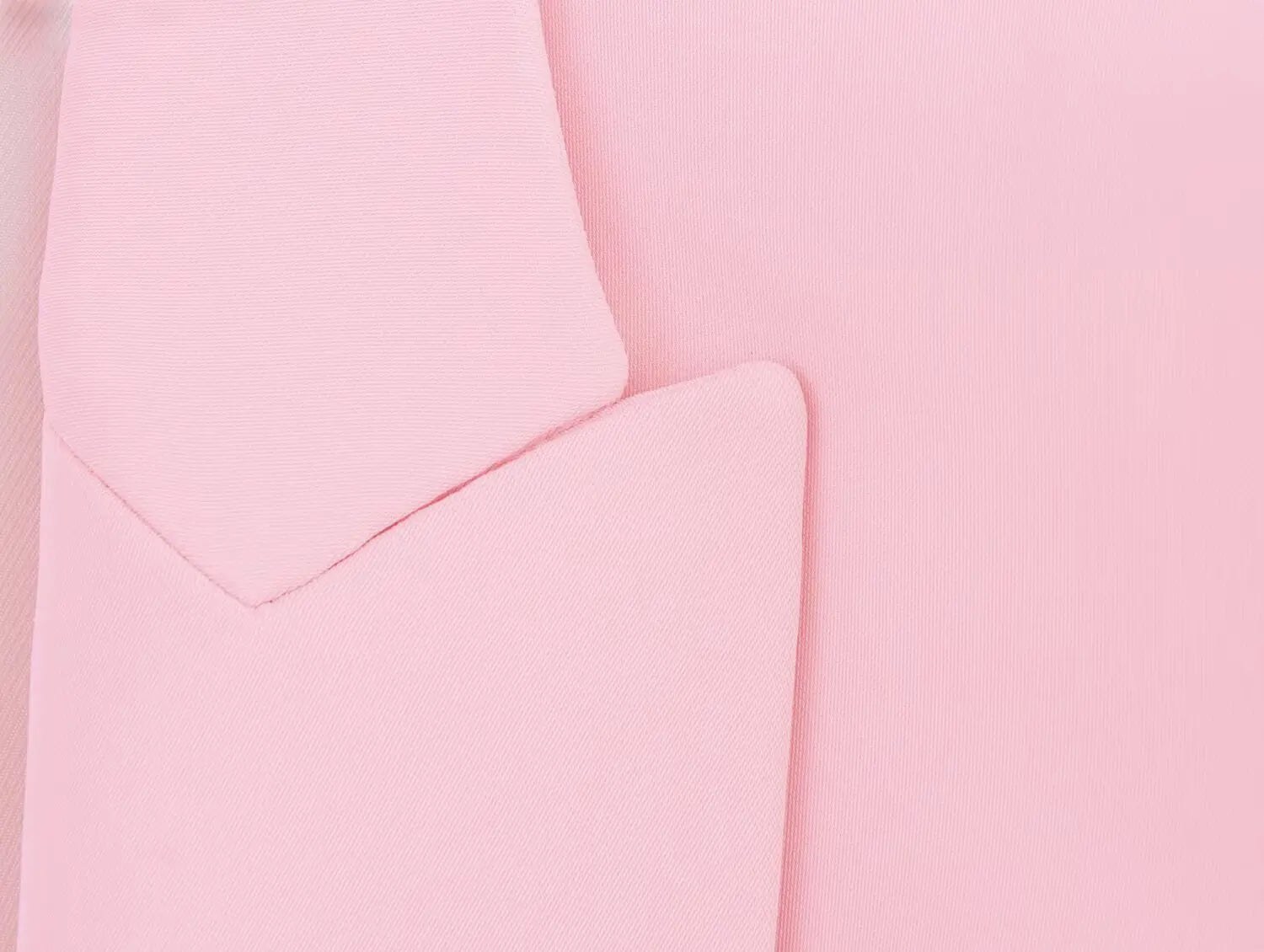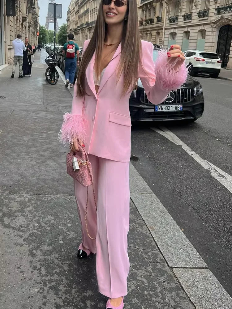 طقم نسائي وردي من HH Fashion، يتكون من سترة ريشية بياقة مطوية وأكمام طويلة وصدر واحد + بنطال طويل بسحاب وجيوب وخصر مرتفع