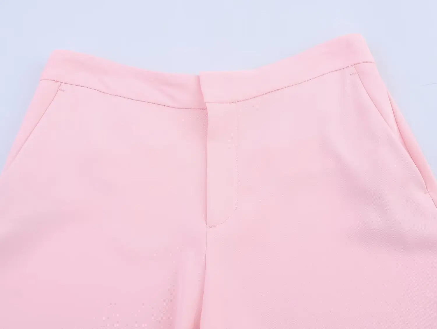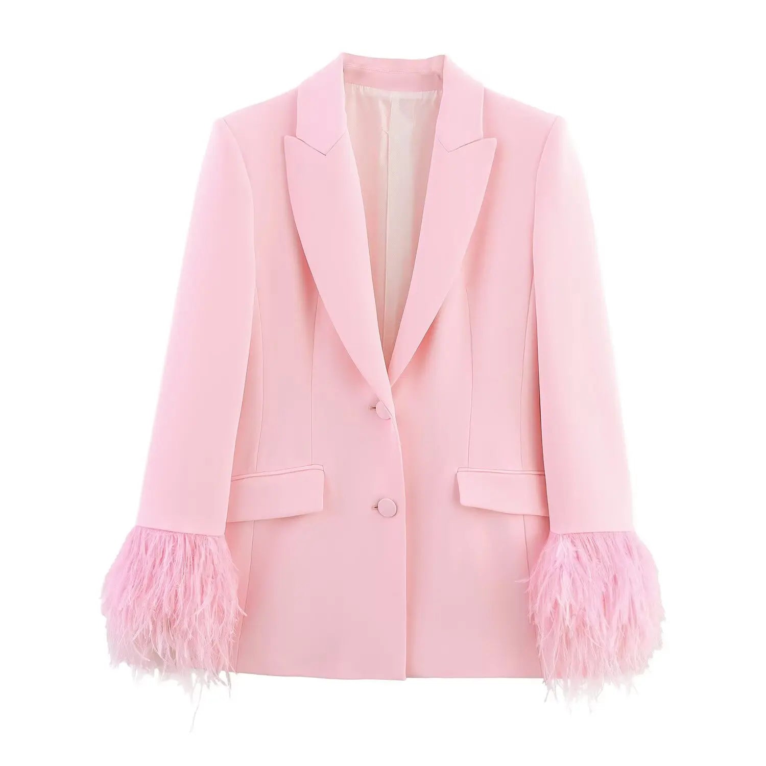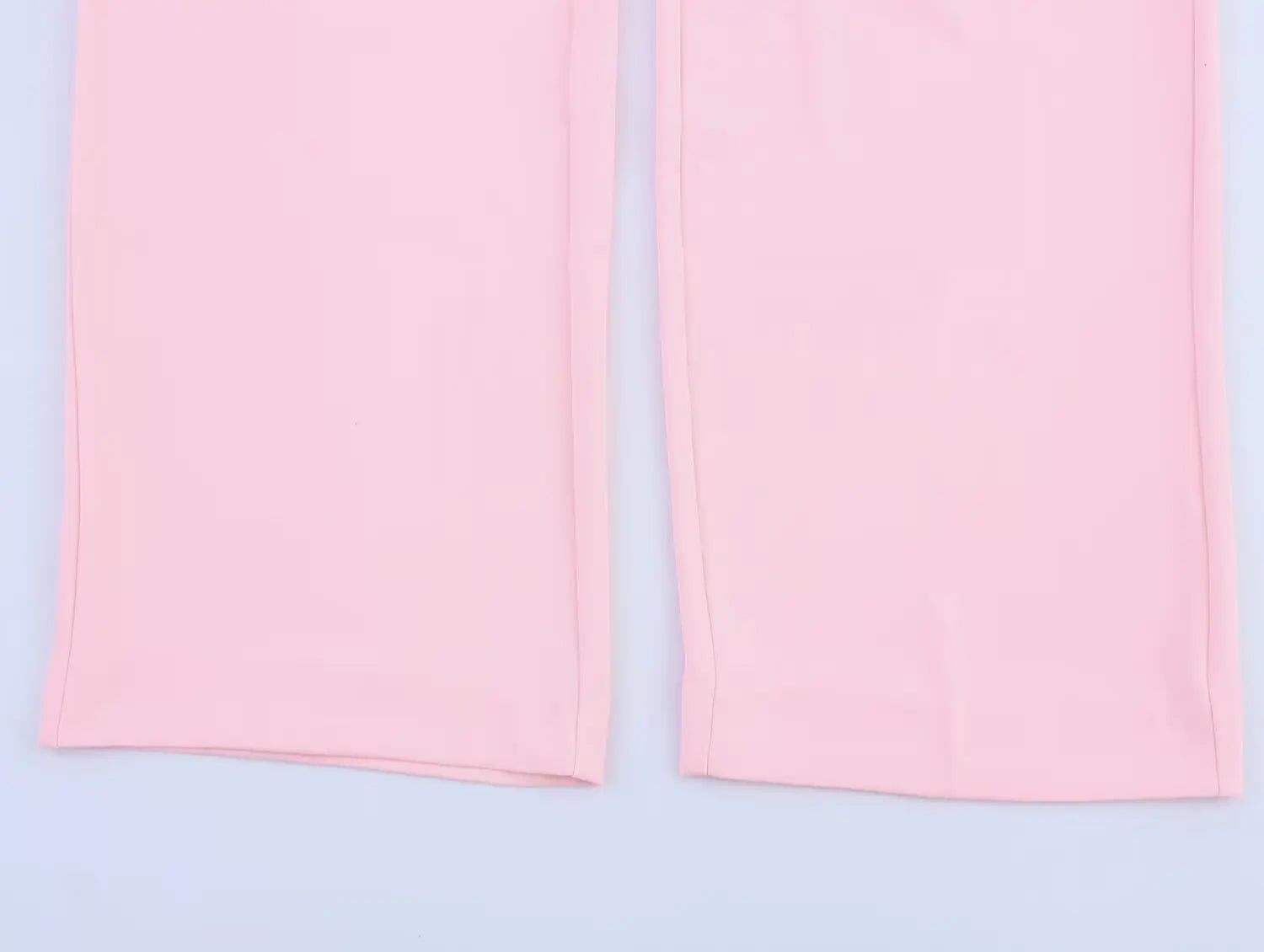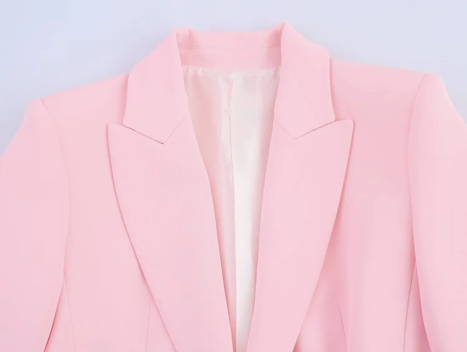 طقم نسائي وردي من HH Fashion، يتكون من سترة ريشية بياقة مطوية وأكمام طويلة وصدر واحد + بنطال طويل بسحاب وجيوب وخصر مرتفع