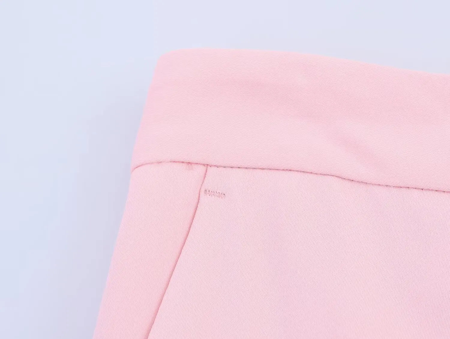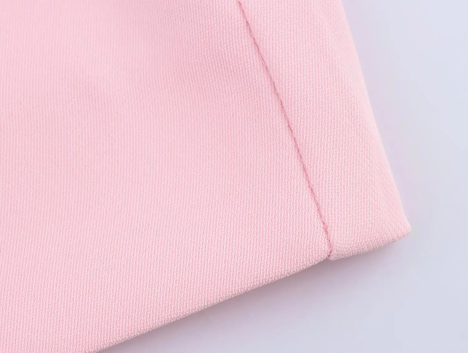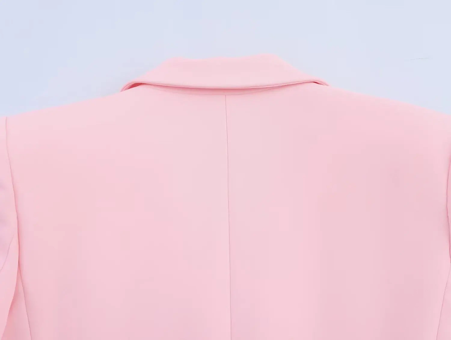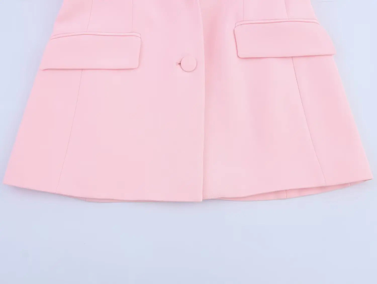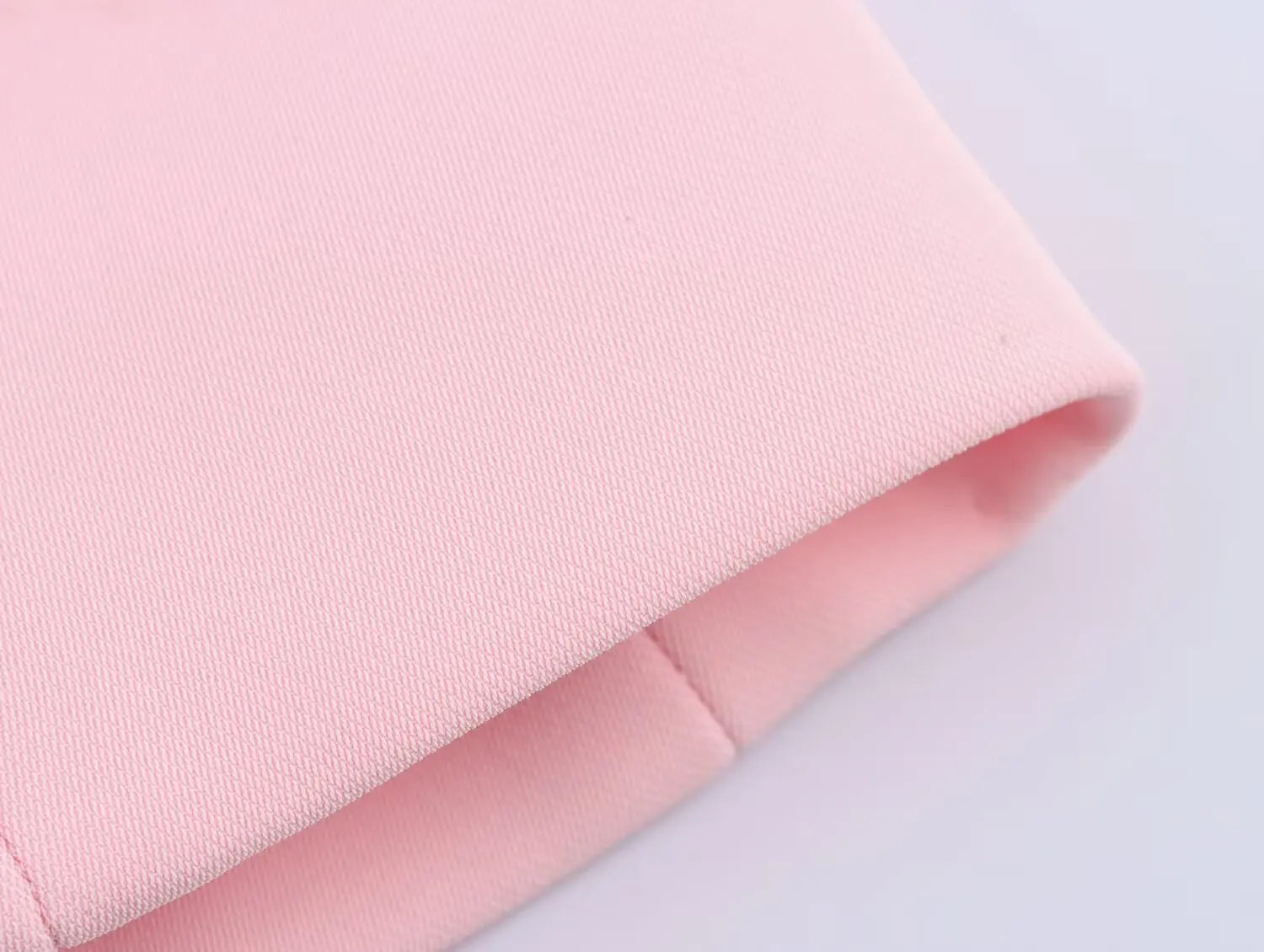 طقم نسائي وردي من HH Fashion، يتكون من سترة ريشية بياقة مطوية وأكمام طويلة وصدر واحد + بنطال طويل بسحاب وجيوب وخصر مرتفع