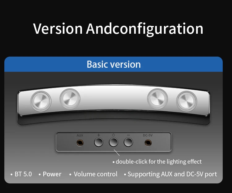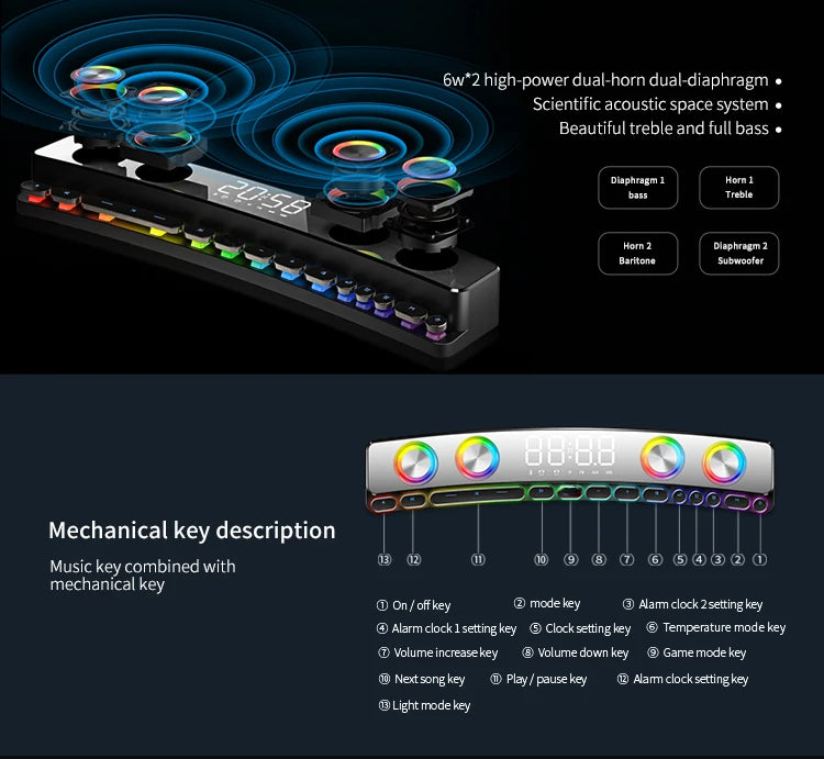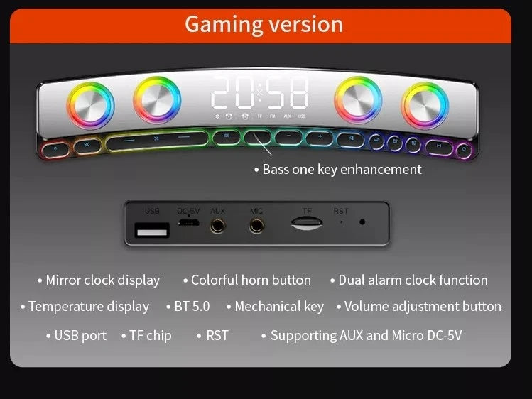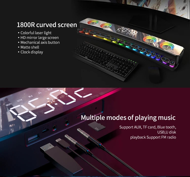 مكبرات صوت بلوتوث عالية الجودة، شريط صوت RGB ثلاثي الأبعاد، ستيريو محيطي، مضخم صوت، AUX، راديو FM، ساعة منزلية، كمبيوتر، مركز موسيقى، جديد وجذاب