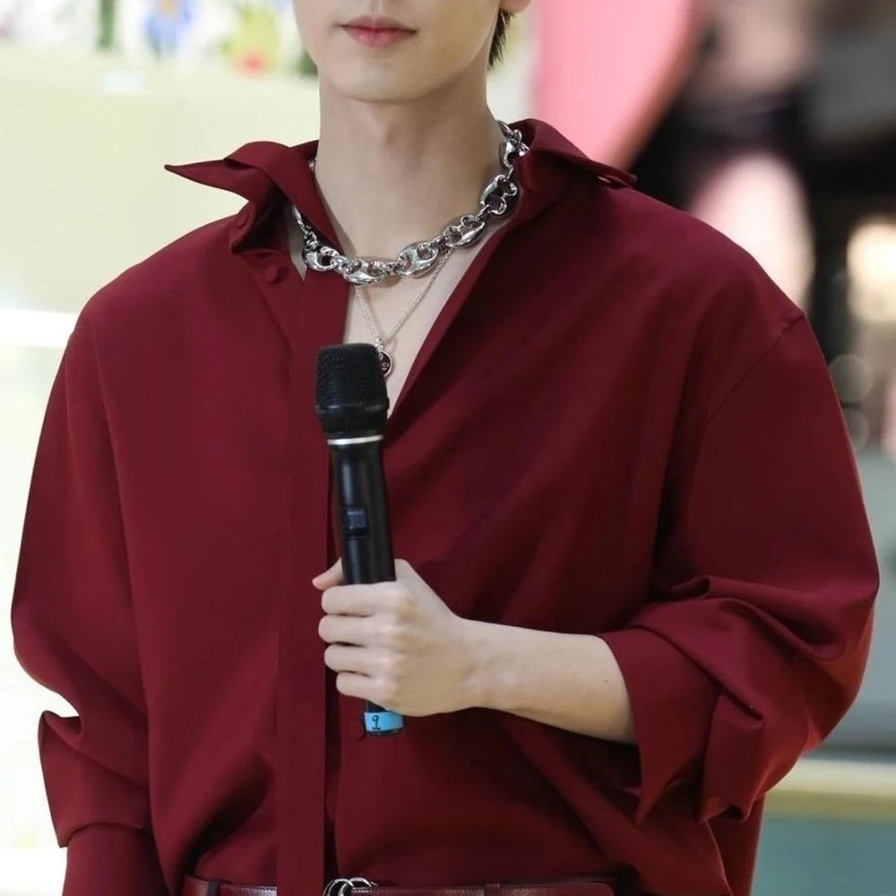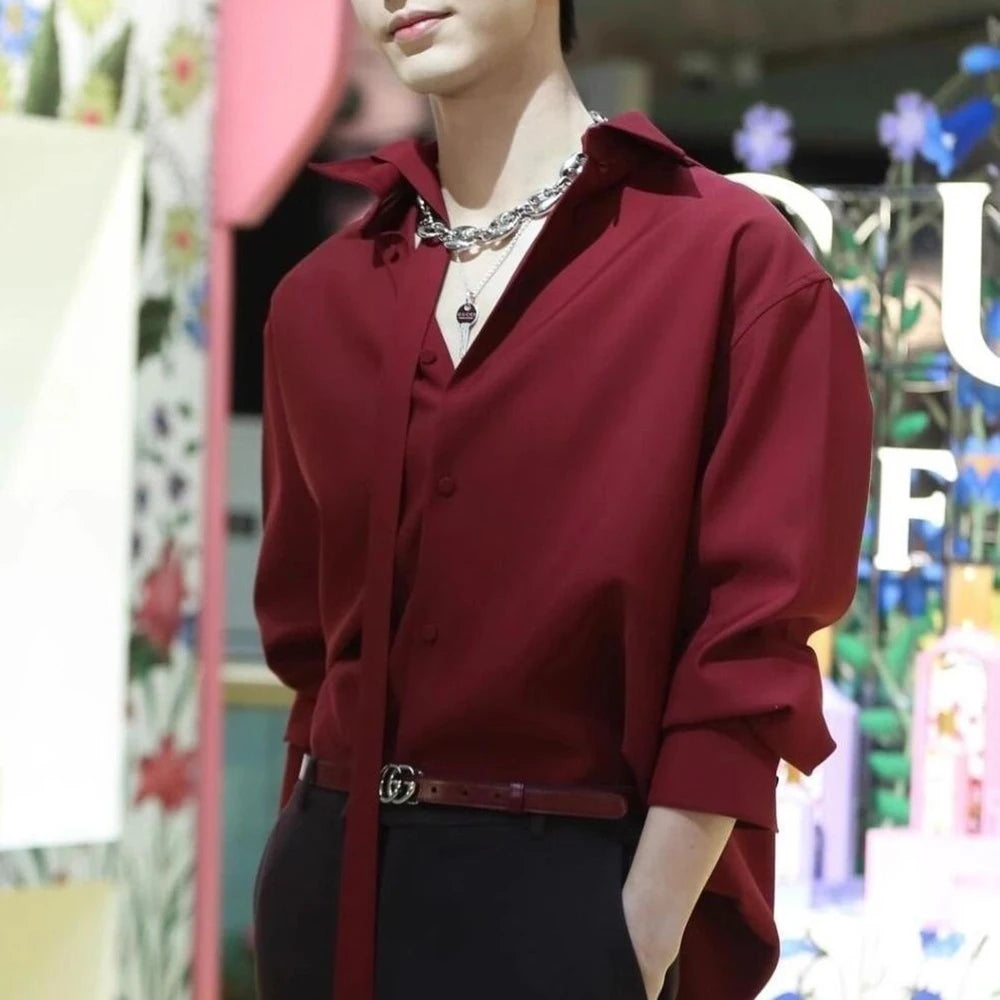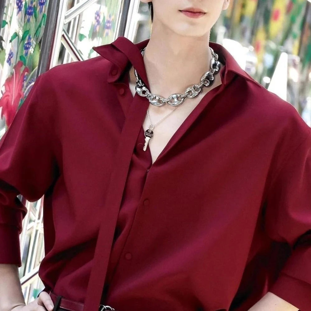 قميص رجالي أنيق للحفلات الراقصة باللون الأحمر الخمري بأكمام طويلة، تصميم مميز لصيف 2025، قميص رجالي فاخر بتصميم عتيق أنيق مناسب لفصل الربيع