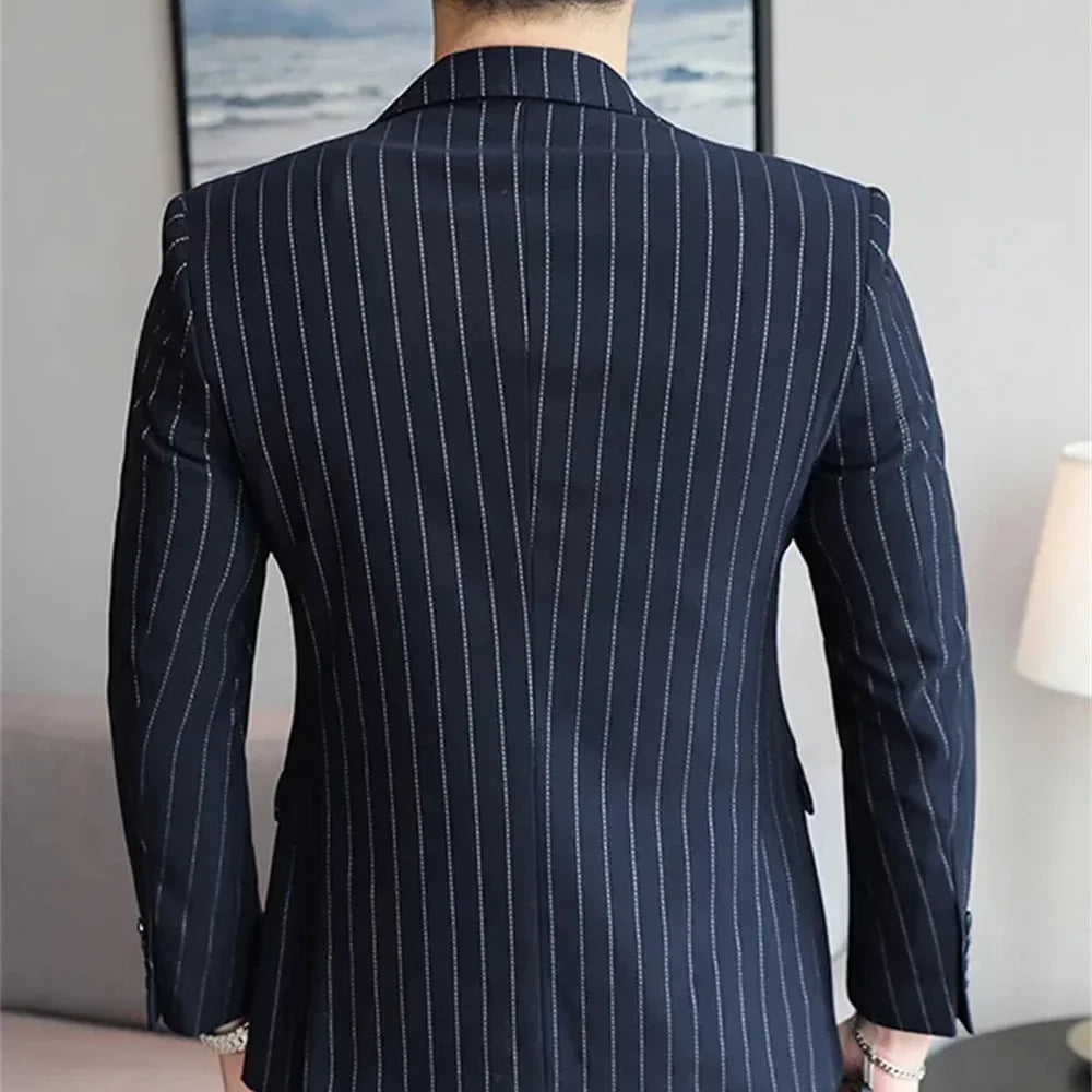 بدلات رجالية 2025 قطعة واحدة أنيقة مخططة باللون الأزرق الداكن بصدر واحد للرجال لحفلات الزفاف والحفلات الراقصة، بليزر رجالي فقط، بدلات ضيقة، بدلة رسمية