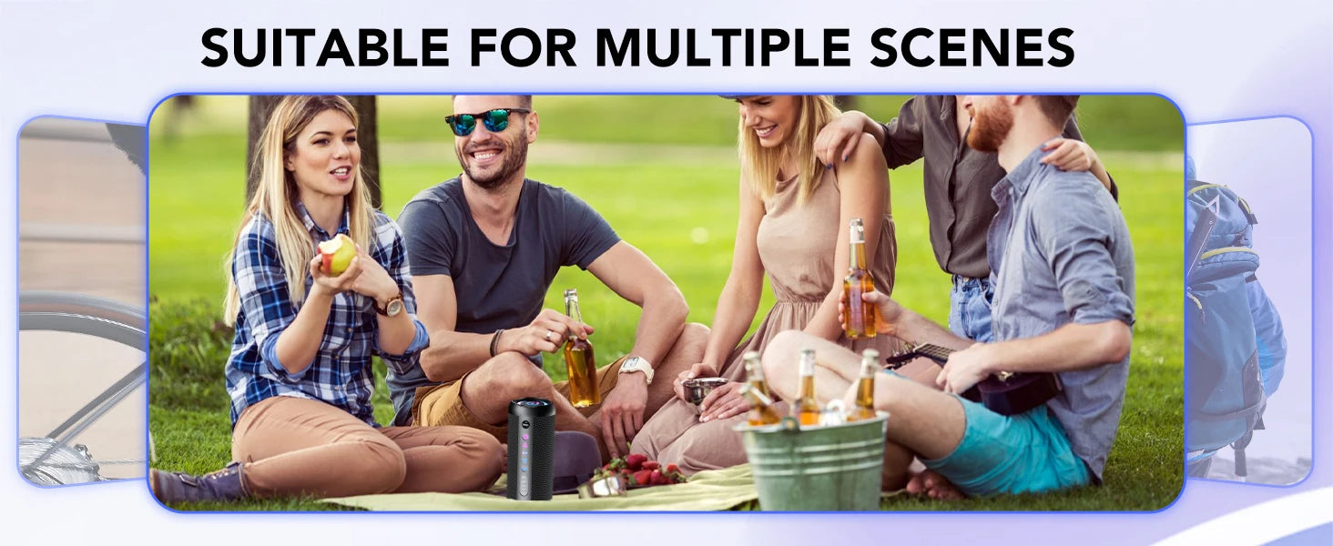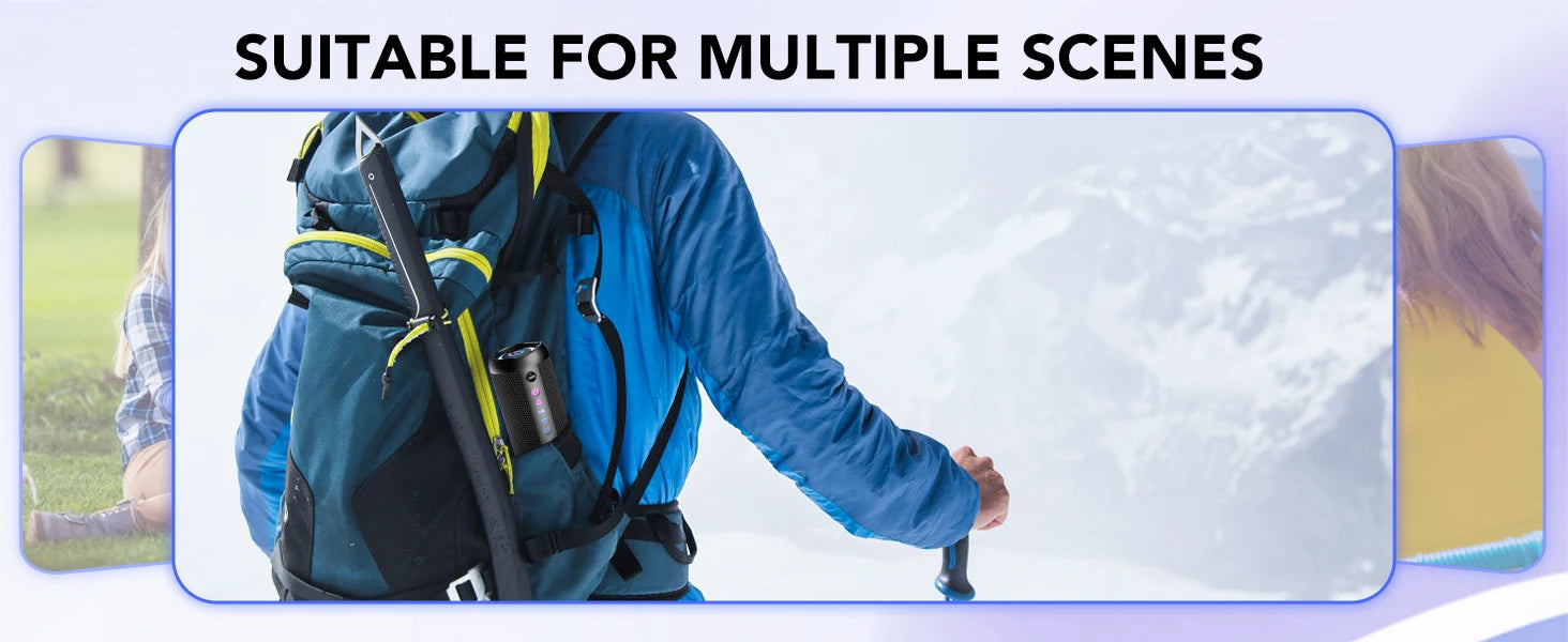 مكبر صوت محمول بتقنية بلوتوث، مكبر صوت بتقنية بلوتوث 5.4، مكبر صوت مزدوج بقوة 30 وات، صوت جهير عميق، مدة تشغيل تصل إلى 30 ساعة، 3 أوضاع معادل صوت، أضواء RGB ملونة