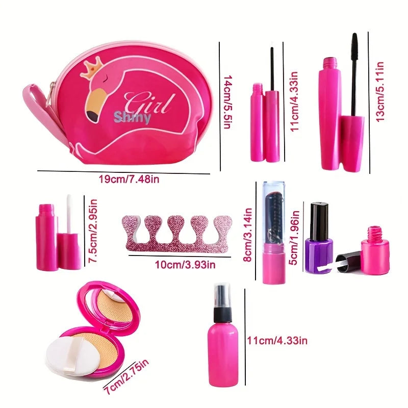 تتضمن مجموعة مكياج العيون: حقيبة مستحضرات التجميل، كريم الأساس، الماسكارا، محدد العيون، أحمر الشفاه، 2 طلاء أظافر، أداة تزيين الأظافر، رذاذ، ملمع الشفاه.
