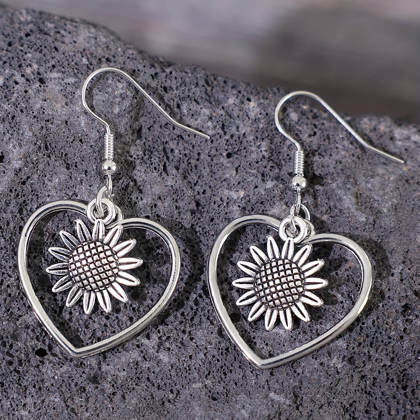أقراط متدلية بتصميم قلب مجوف على شكل عباد الشمس بتصميم بوهيمي عتيق مصنوعة من سبائك الزنك ومطلية بالفضة، هدية عصرية للنساء