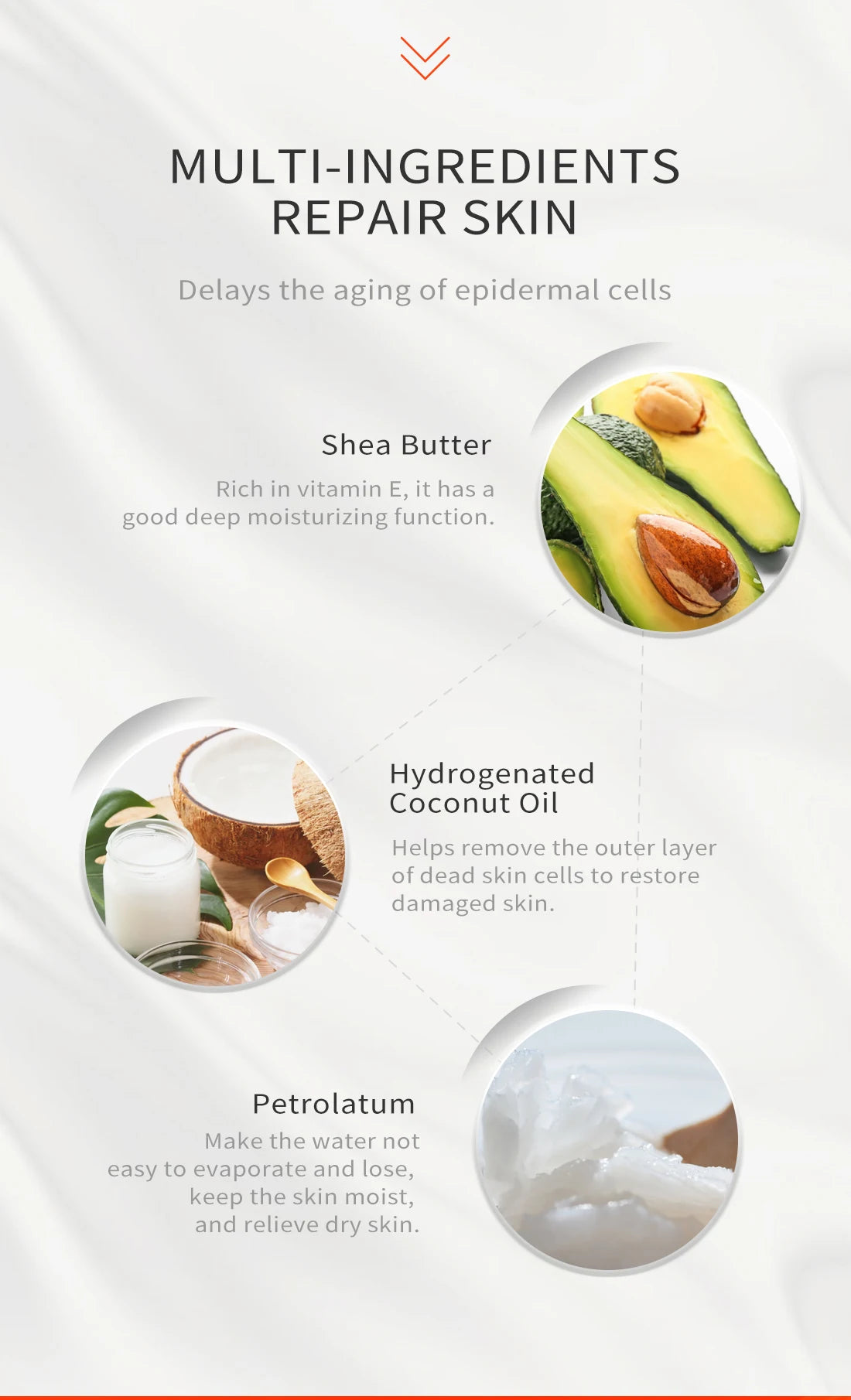 فازلين، ترايديسيل تريميليتات، بولي إيزوبوتين، إيثيل هكسيل بالميتات، بولي ديسين مهدرج، زيت جوز الهند المهدرج، بولي إيثيلين، أوزوكيريت، بولي جليسيريل-2 تريزوستيرات، توكوفيرول، زيت بوتيروسبيرموم باركي (زبدة الشيا)