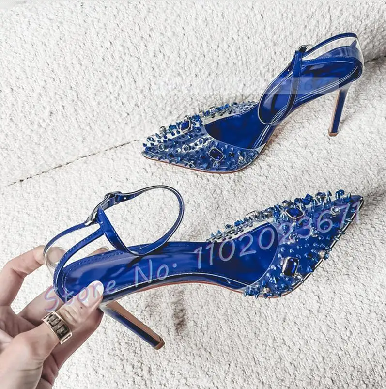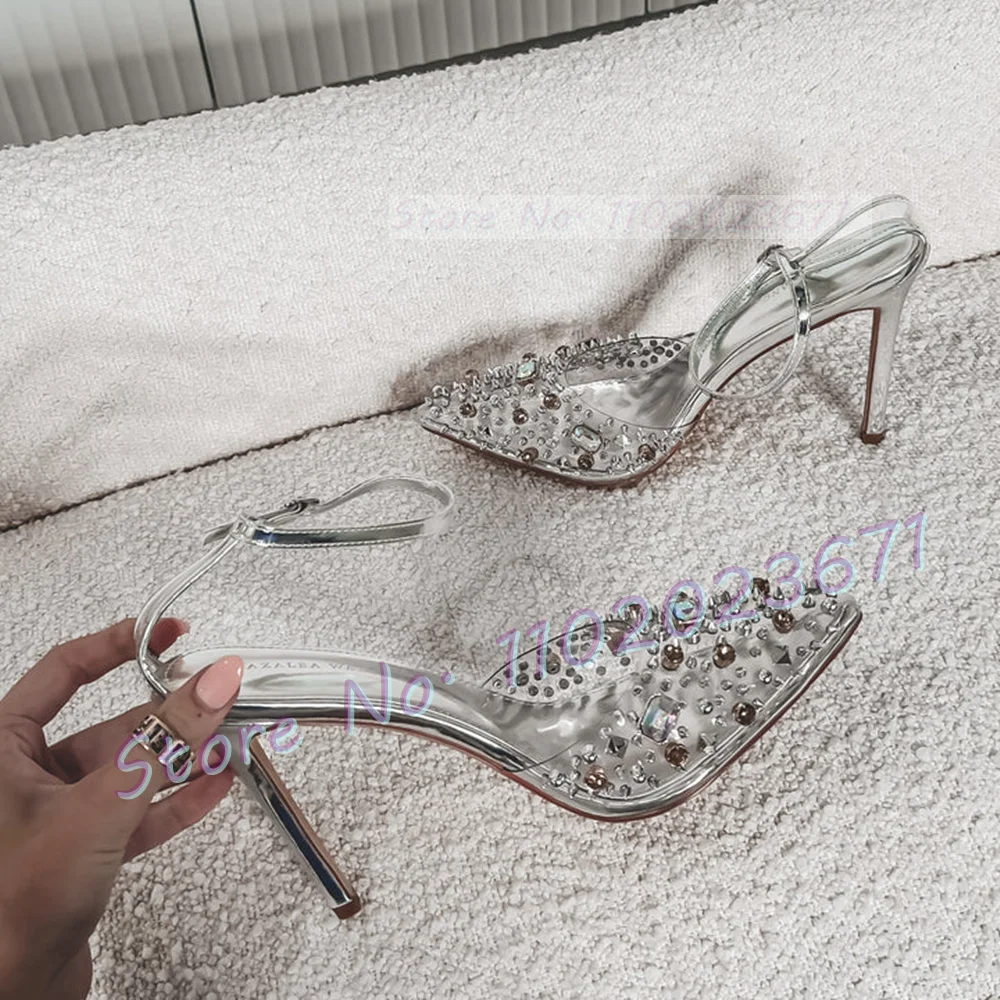 Studded Skinny Heels Pvc Sandals Women Summer Luxury Colorful Gems Clear Shoes Female Sweet Pointy Ankle Strap Banquet Sandals