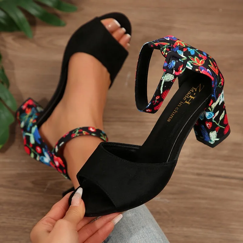 Summer New Thick Heel Sandals for Women Round Head Open-toe Line with Printed Non-slip Wear-resistant Fish Mouth High Heels