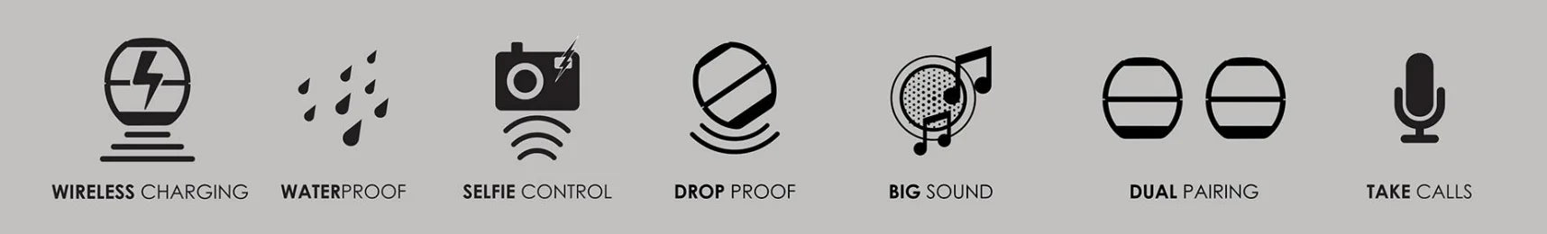 مميزات مقاومة للماء / صوت جهير عالي / تشغيل / إيقاف مؤقت / TWS / التحكم في الصور الشخصية / V+ V- / مكالمات بدون استخدام اليدين / حبل مرن.