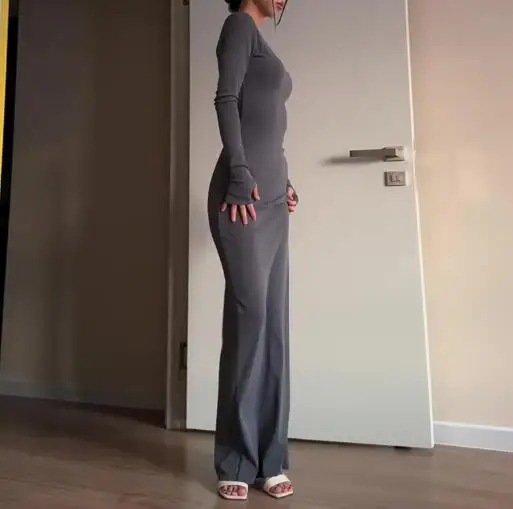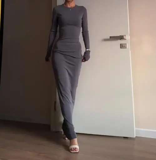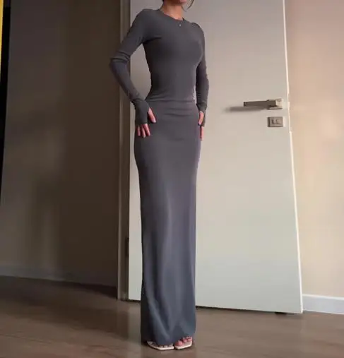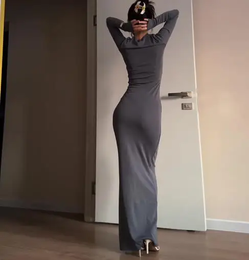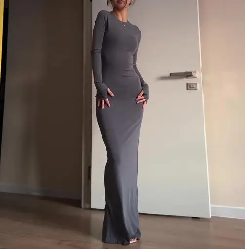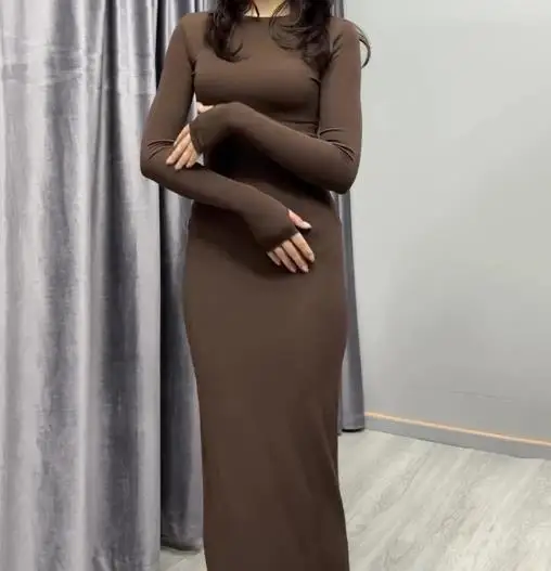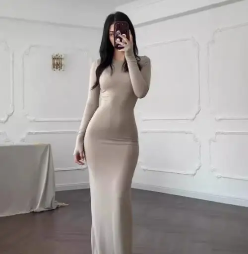 فساتين نسائية ربيع وخريف 2025 موضة جديدة مثيرة نحيفة تعانق الورك مريحة بلون سادة فستان طويل غير رسمي برقبة مستديرة