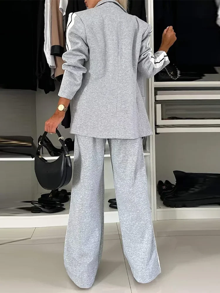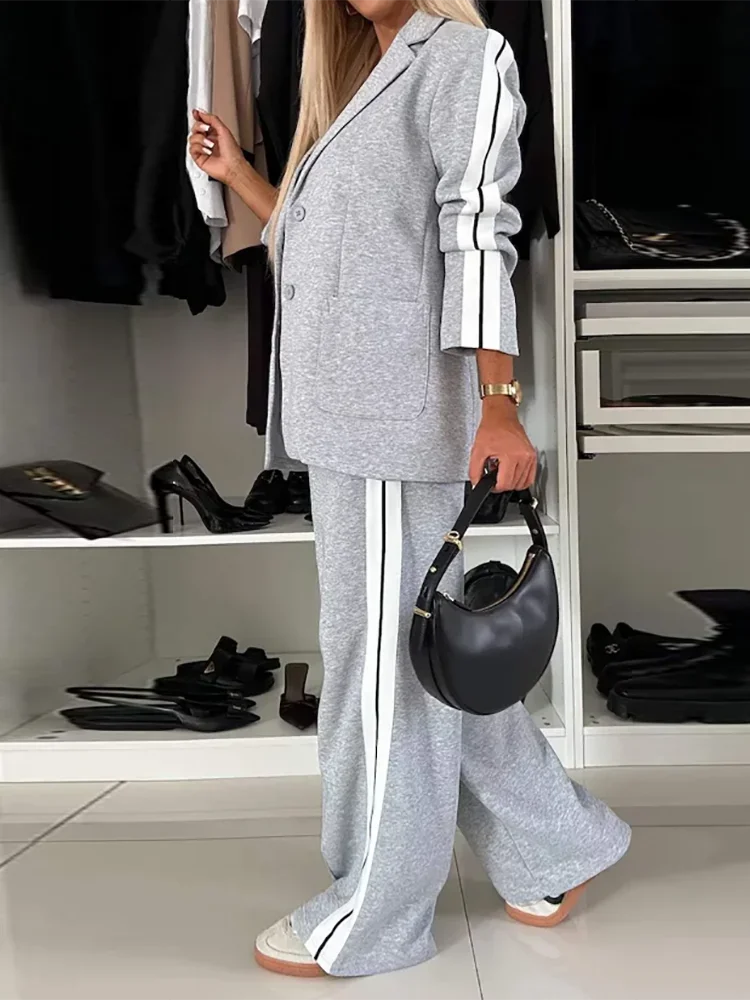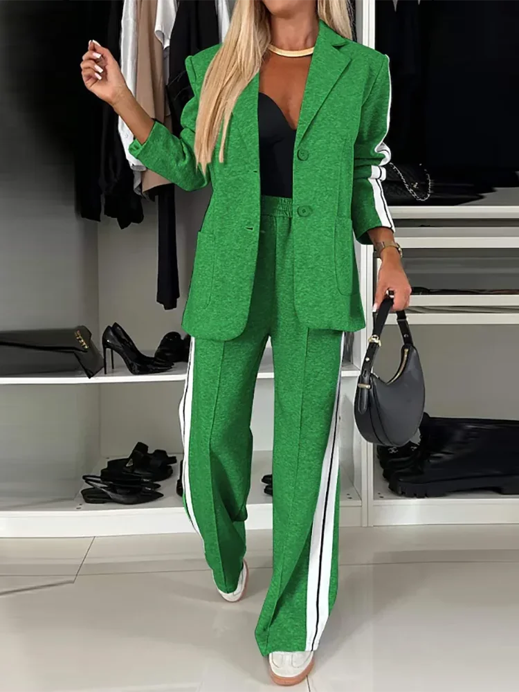 طقم نسائي كاجوال من قطعتين لخريف وشتاء، لون سادة، معطف بليزر بأكمام طويلة، خصر مرتفع، ساق مستقيمة، بنطال بدلة