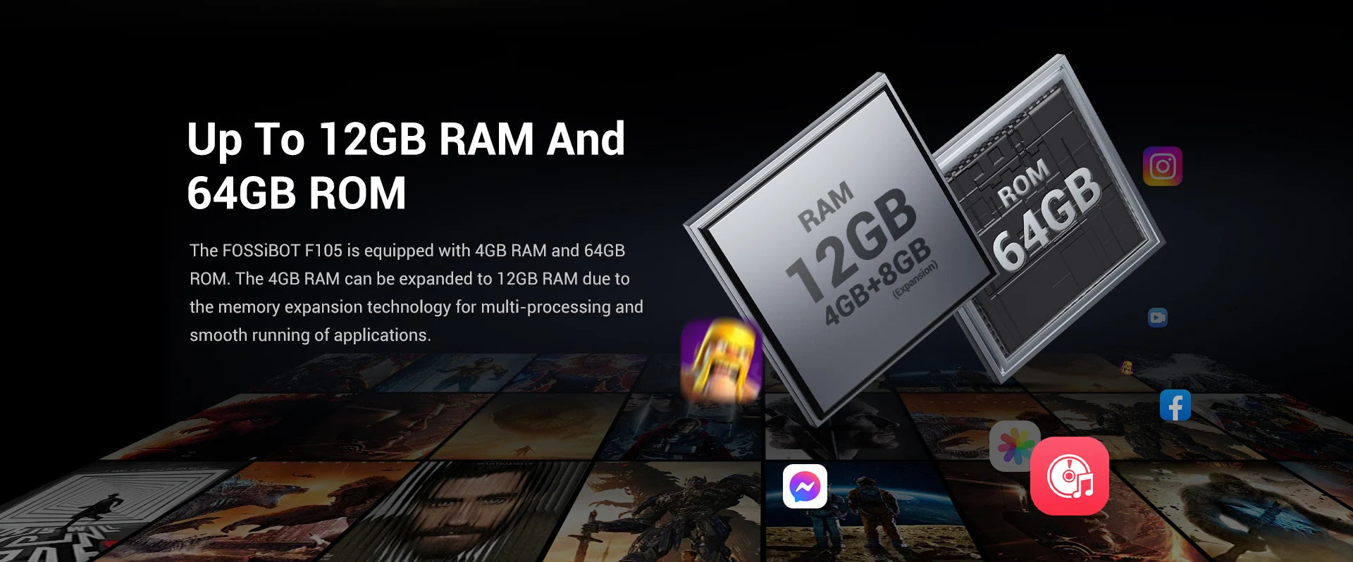 تم تجهيز FOSSiBOT F105 بذاكرة وصول عشوائي (RAM) بسعة 4 جيجابايت وذاكرة قراءة فقط (ROM) بسعة 64 جيجابايت. يمكن توسيع ذاكرة الوصول العشوائي (RAM) بسعة 4 جيجابايت إلى 12 جيجابايت بسبب تقنية توسيع الذاكرة للمعالجة المتعددة والتشغيل السلس للتطبيقات.