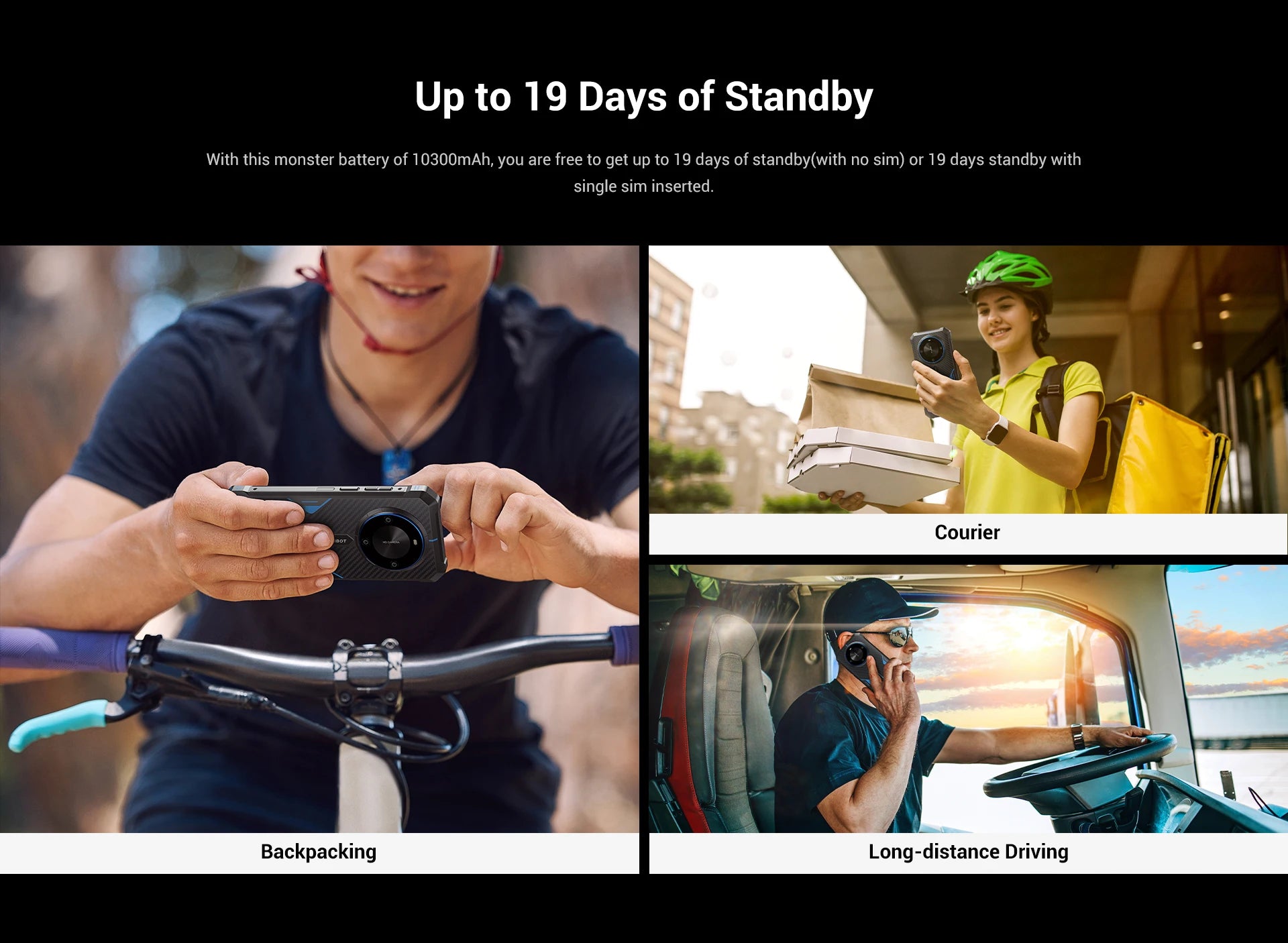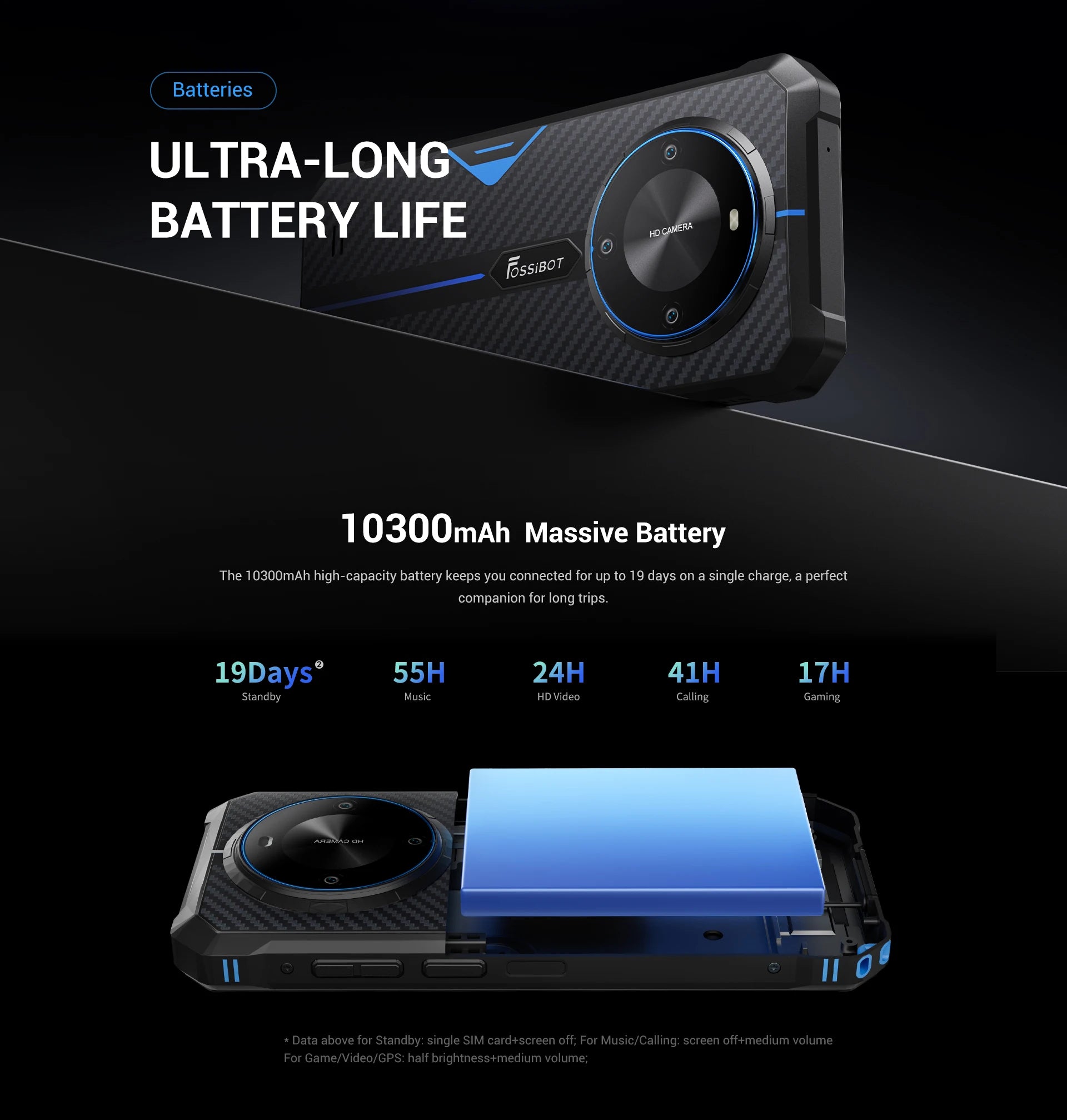 بفضل هذه البطارية الضخمة التي تبلغ سعتها 10300 مللي أمبير في الساعة، يمكنك الحصول على ما يصل إلى 19 يومًا من وضع الاستعداد (بدون شريحة SIM) أو 19 يومًا من وضع الاستعداد مع إدخال شريحة SIM واحدة.