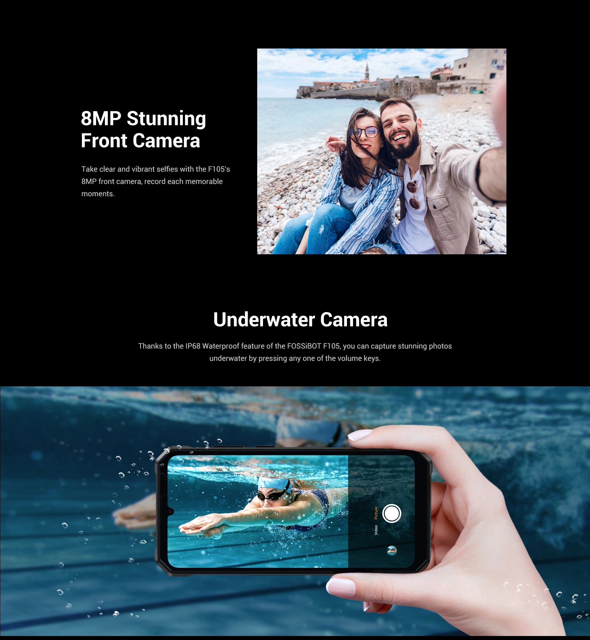 بفضل ميزة مقاومة الماء IP68 الموجودة في FOSSiBOT F105، يمكنك التقاط صور مذهلة تحت الماء بالضغط على أي من مفاتيح الصوت.