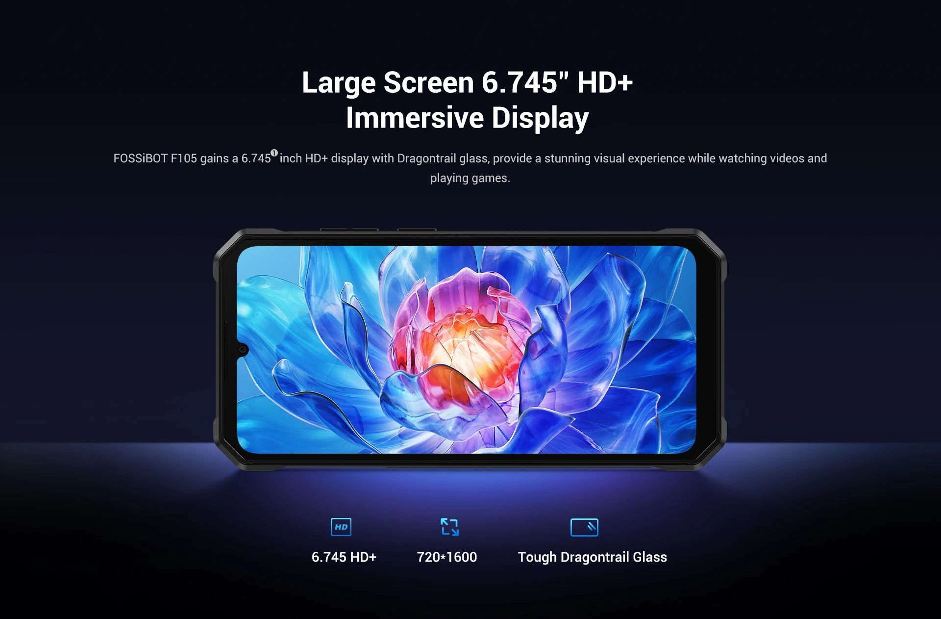 يتمتع FOSSiBOT F105 بشاشة HD+ مقاس 6.745 بوصة مع زجاج Dragontrail، مما يوفر تجربة بصرية مذهلة أثناء مشاهدة مقاطع الفيديو ولعب الألعاب.