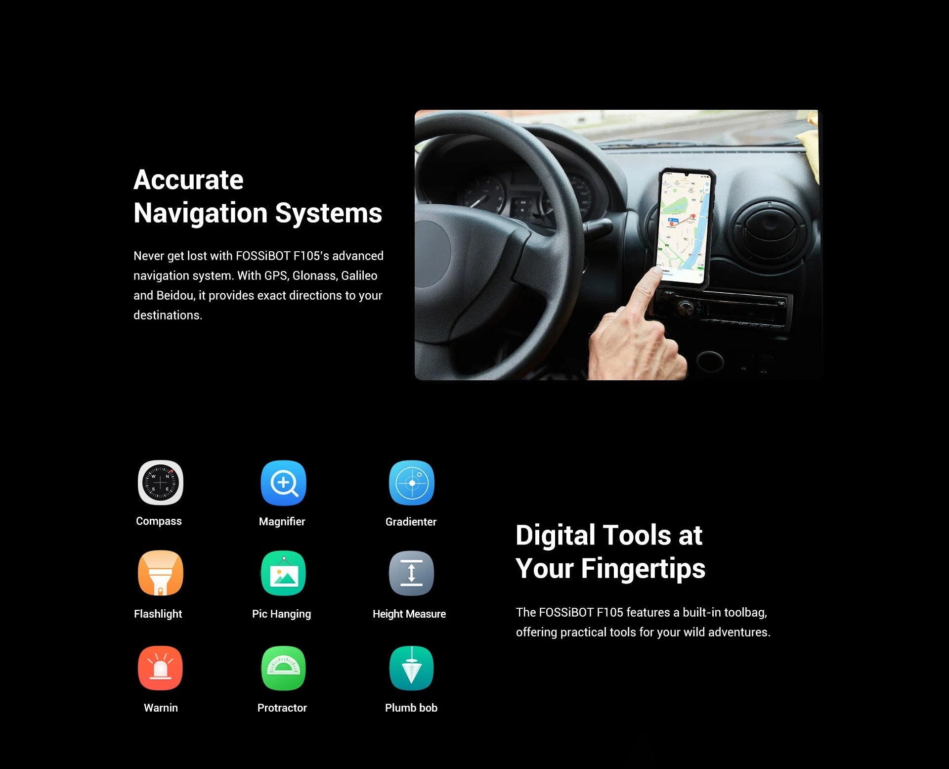 لا تضيع أبدًا مع نظام الملاحة المتقدم الخاص بـ FOSSiBOT F105. مع نظام تحديد المواقع العالمي (GPS)، وGlonass، وGalileo، وBeidou، فإنه يوفر اتجاهات دقيقة إلى وجهاتك.