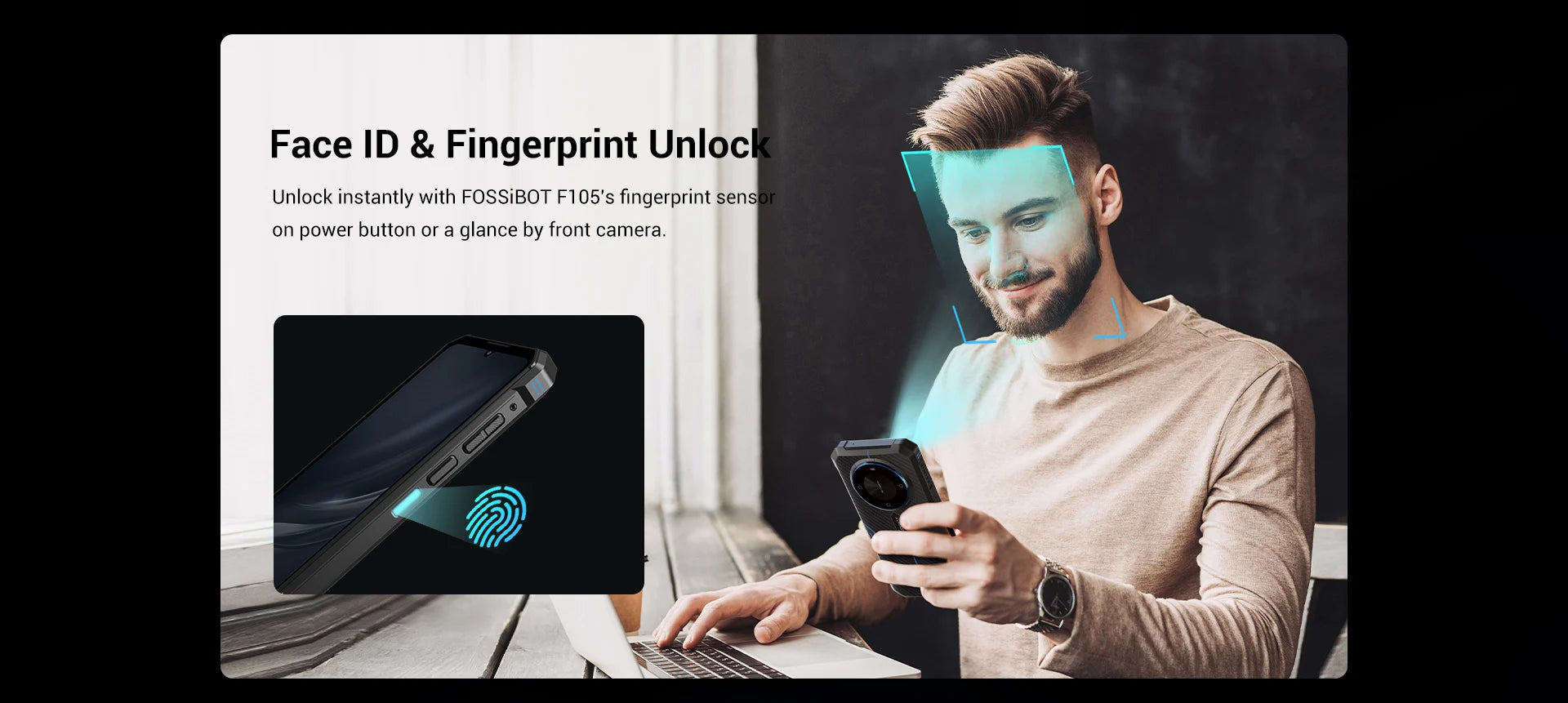 يمكن فتح القفل على الفور باستخدام مستشعر بصمة الإصبع الموجود على زر الطاقة في FOSSiBOT F105 أو من خلال نظرة سريعة عبر الكاميرا الأمامية