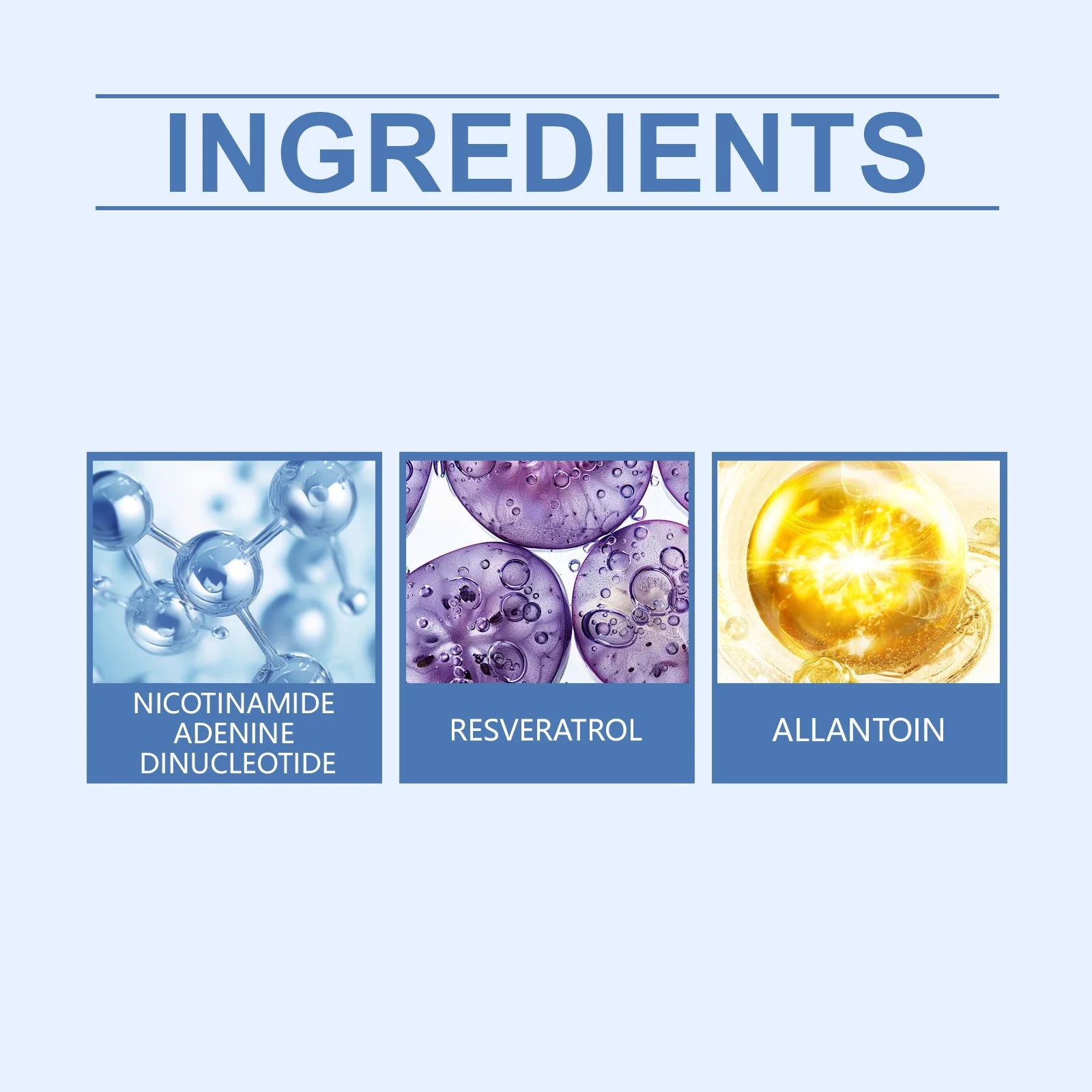 ●INGREDIENTS:AQUA、 GLYCERIN、HYDROXYETHYLCELLULOSE、1,2-HEXANEDIOL、ALLANTOIN、NICOTINAMIDE ADENINE DINUCLEOTIDE、NICOTINAMIDE MONONUCLEOTIDE、RESVERATROL、LAVANDULA ANGUSTIFOLIA (LAVENDER) OIL、DISODIUM EDTA
