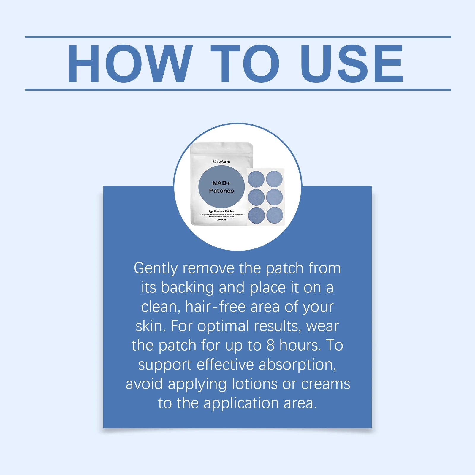 Gently remove the patch from its backing and place it on a clean, hair-free area of your skin. For optimal results, wear the patch for up to 8 hours. To support effective absorption, avoid applying lotions or creams to the application area.