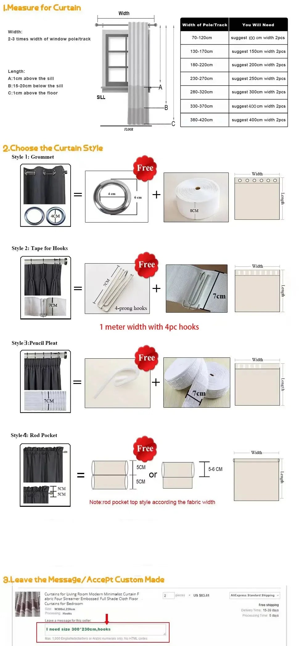 8.If the height of the curtain and tulle you choose exceeds 2.7M, we will use two pieces of cloth to make it, please pay attention!