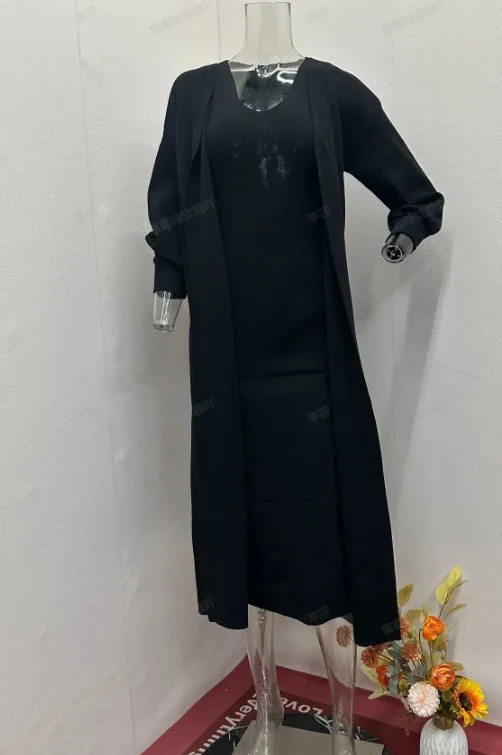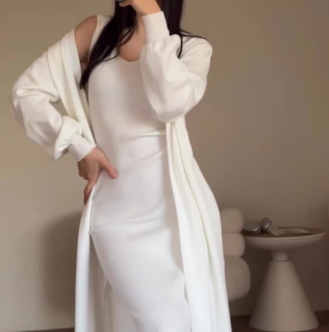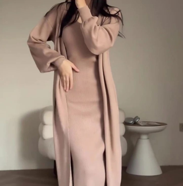 Women's Fashion Elegant Two piece Solid Color Lazy Style Long Sleeve Knitted Sweater Slimming Strap Long Skirt Set
