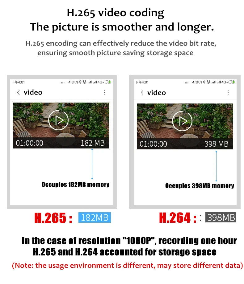 H.265+ doubles the coding effieciency, which means that 1. H.265 saves space; 2. store more videos; 3. provide super smooth to view video compared with H.264