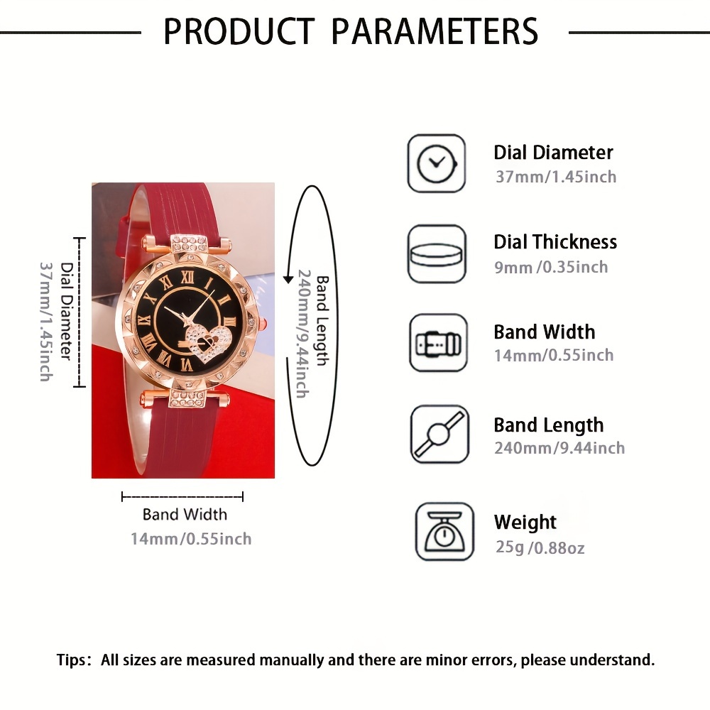 5 Pcs Red Quartz Watches PU Leather Strap Zinc Alloy Pointer Zinc Alloy Dial And Rhinestone Necklace Ring Jewelry For Valentine's Day, Easter Ramadan, Birthday, Mother's Day Gifts For Eid
