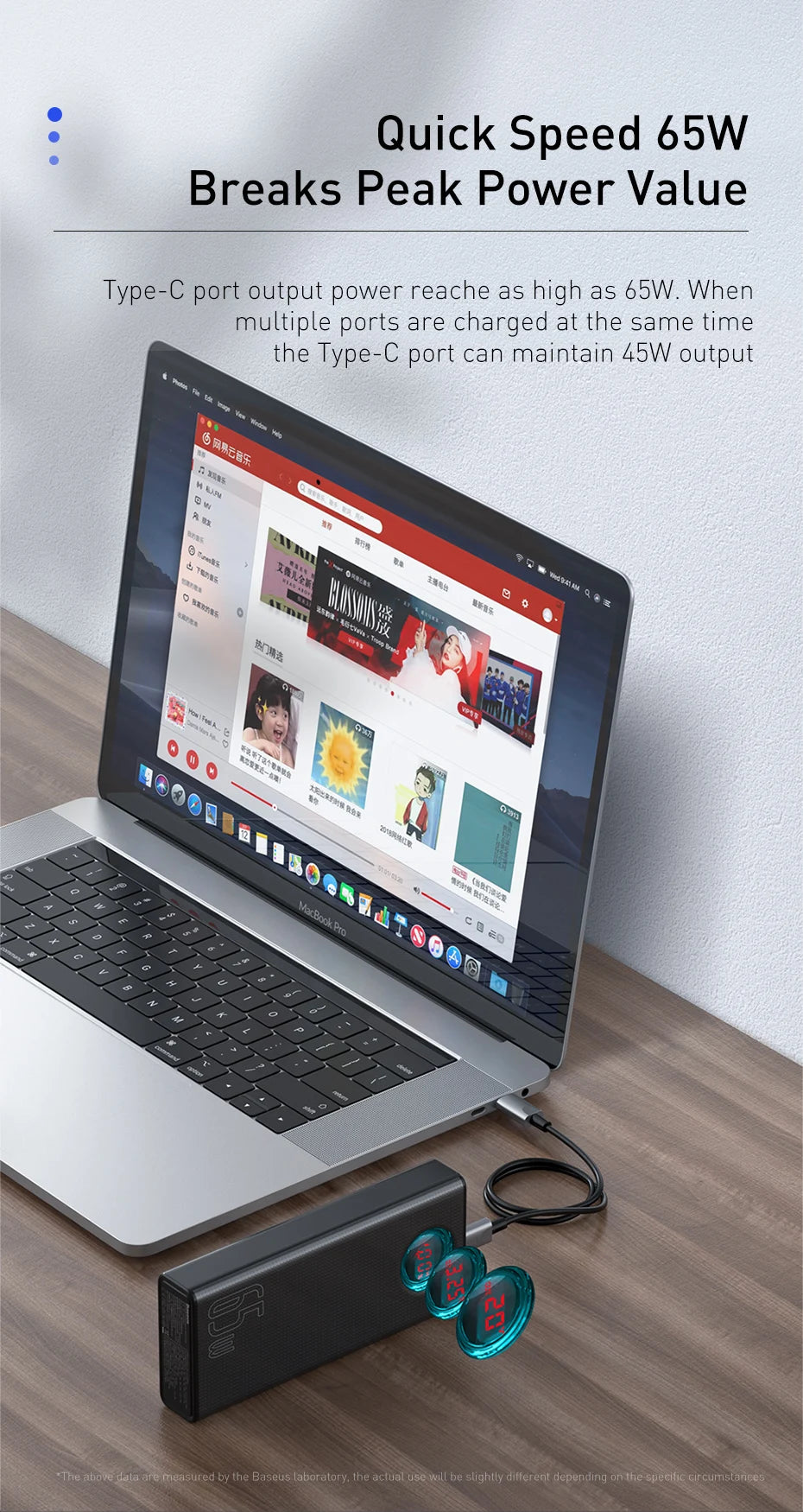 Baseus 65W Power Bank 30000mAh PD Quick Charge FCP SCP Powerbank Portable External Charger For Smartphone Laptop iPhone Tablet