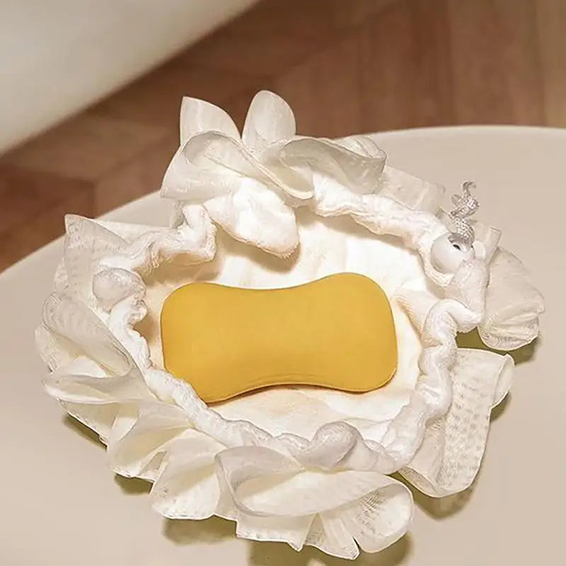 4.Secure Soap Fixation: Crafted for extended use, this bath sponge resists wear while offering secure soap fixation and moisture prevention through its quick-dry suspension and elastic pocket design, ensuring lasting performance with every bath routine