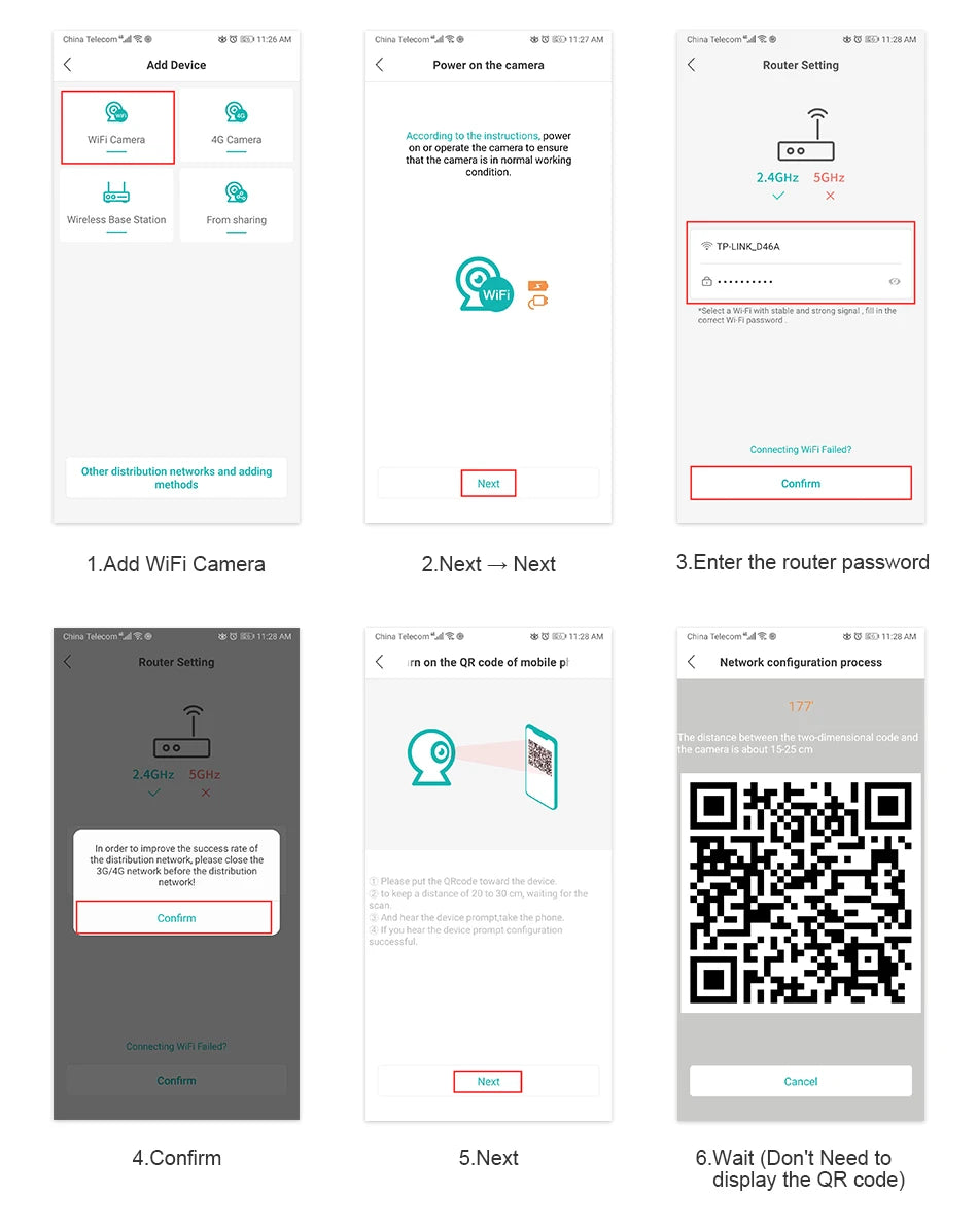 โข Connect the camera through the 2.4G HZ Wifi network band, follow the 6 steps in the picture to connect, and you can configure it successfully.