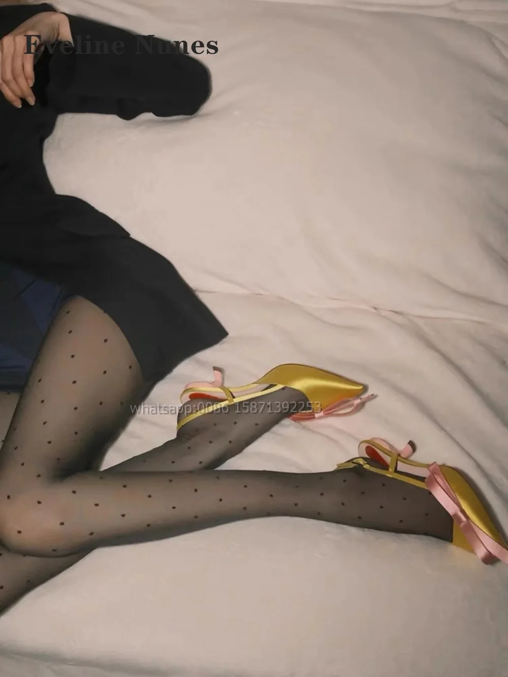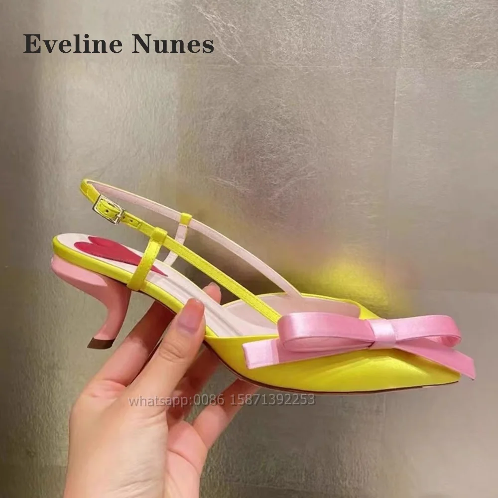Bow Heart-Shaped Satin Sandals Pointed Toe Thin Heels Back Strap Side Air Slingback Women Pumps Buckle Strap Mixed Colors Shoes