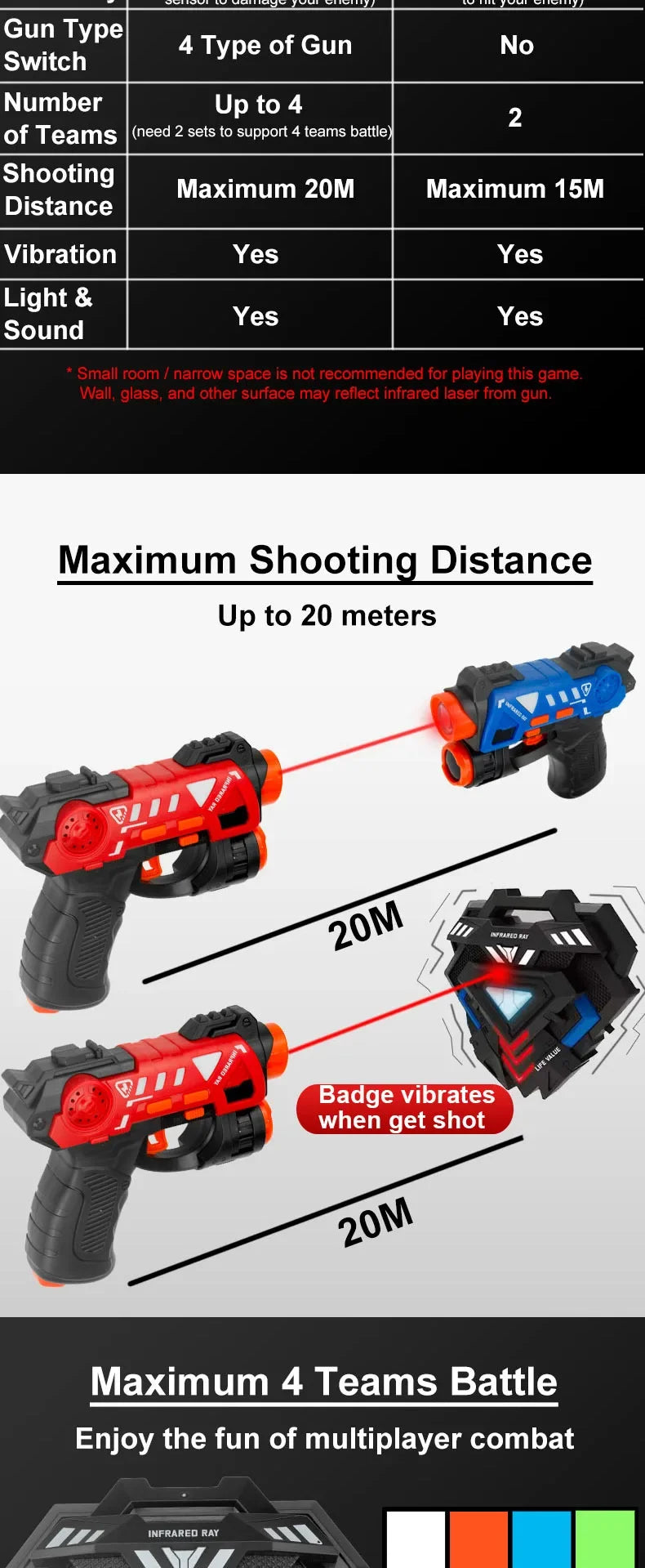 * Support up to 4 teams' battle (need 2 sets), 4 different type of guns