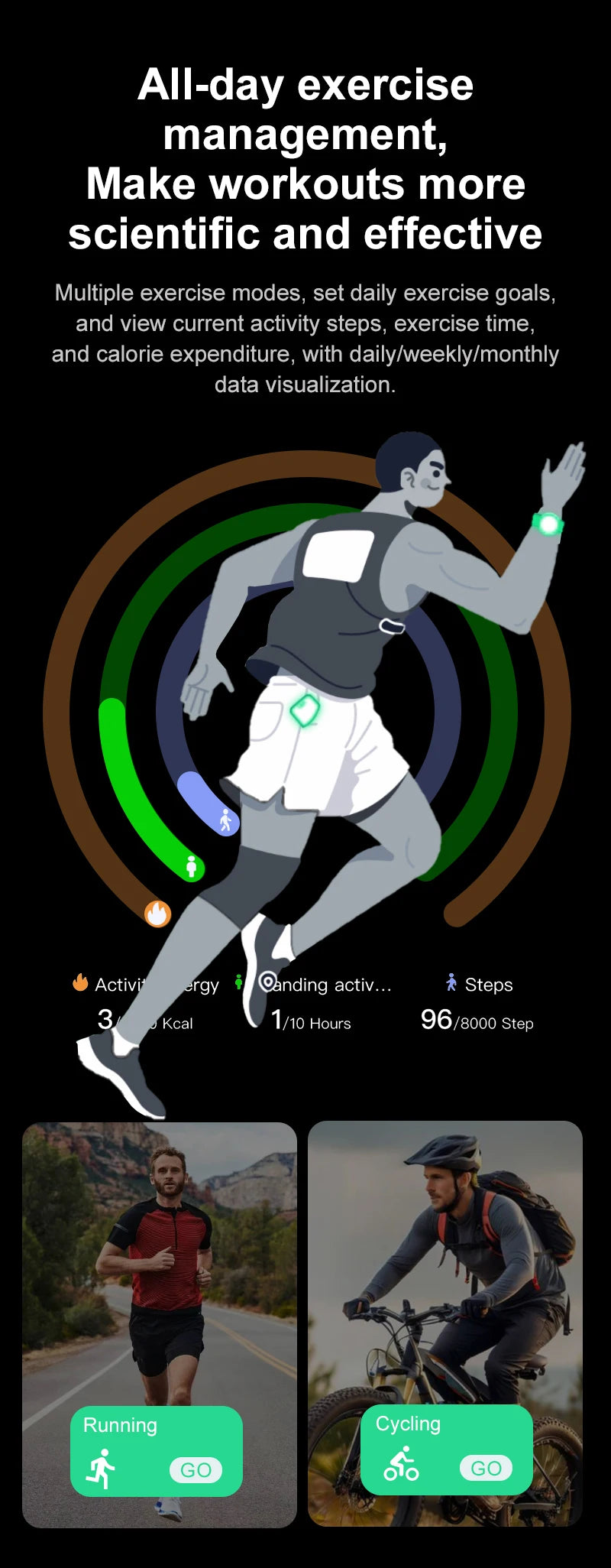 Multiple exercise modes, set daily exercise goalsand view current activity steps, exercise time.and calorie expenditure, with daily/weekly/monthlydata visualization,