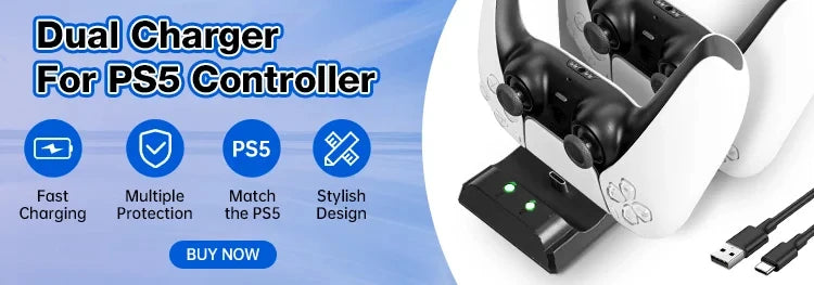 This charging dock is specifically designed for PS5 controllers, the indicator light can clearly display the charging status of the two controllers. The light shows red when charging and green when fully charged.