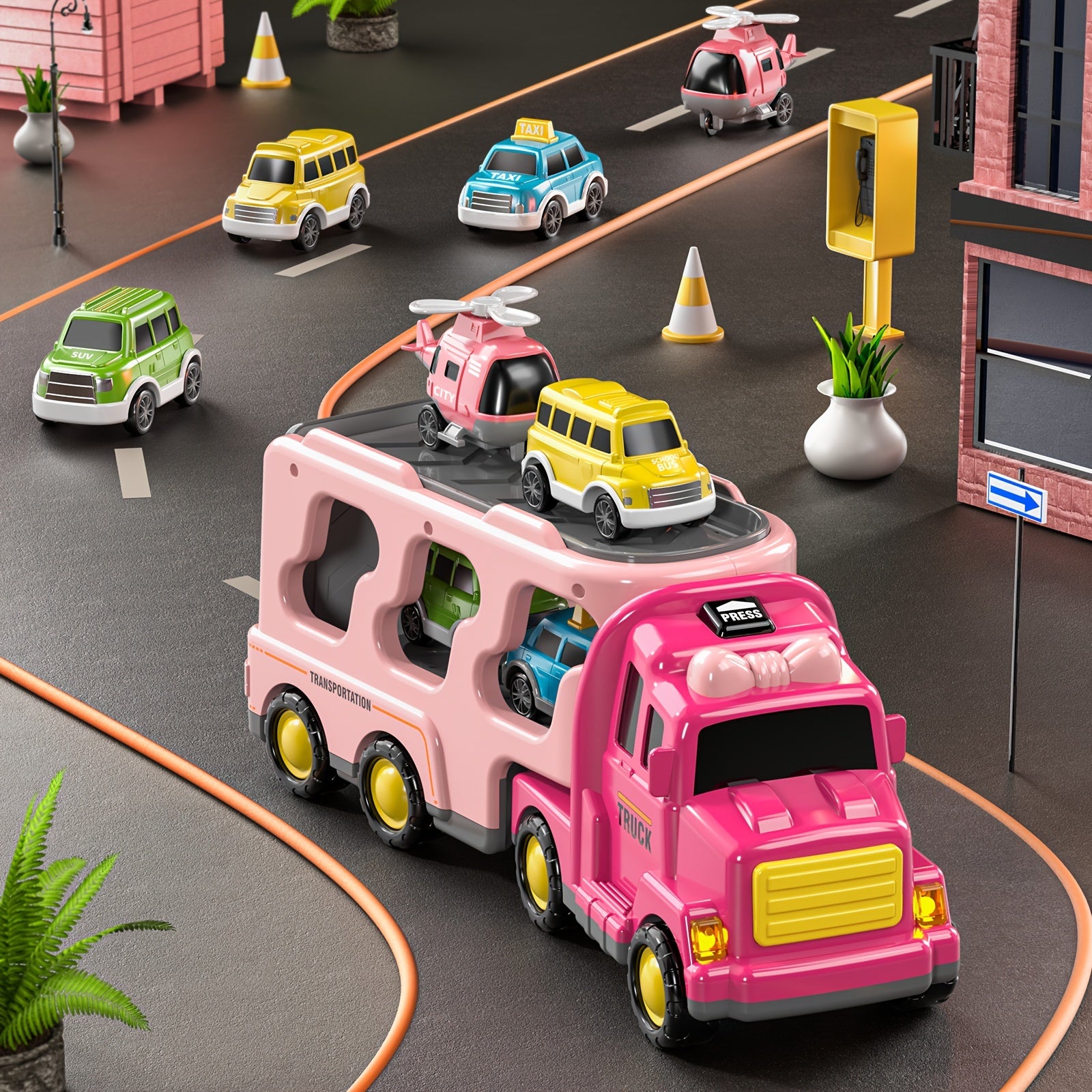 Girls Truck Toys For 3 4 5 6 Year Old Girls, 5-in-1 Friction Power Vehicle Car Toy For Toddlers 3-6, Carrier Toys For Kids 3-5, Christmas Birthday Gifts For Girls Age 3-9
