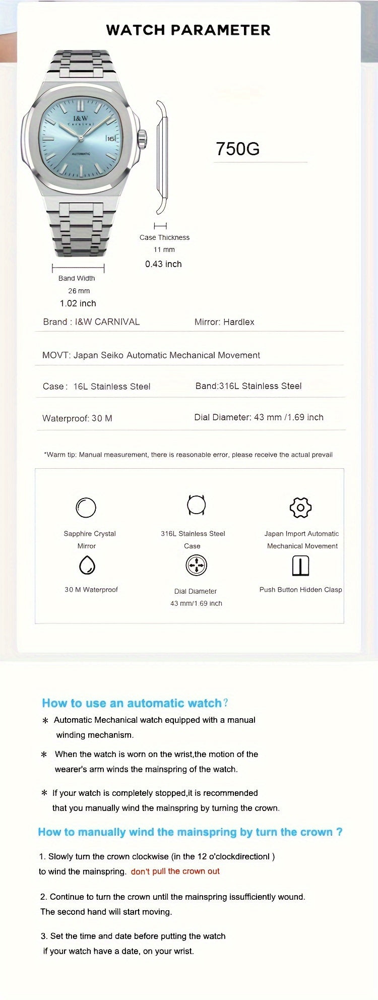 I&W CARNIVAL Men's Automatic Mechanical Watches, Waterproof Strong Luminous Full Steel Auto Date Watch
