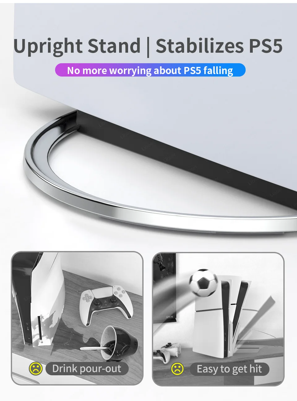 Vertical stand for PS5 slim / PS5 / PS5 Pro Disc&Digital console. 4 Non-slip silicone mats on the bottom and screws for fixing the unit are included. This prevents the PS5 console from falling due to unexpected bumps against the console and keeps the console in a stable position.