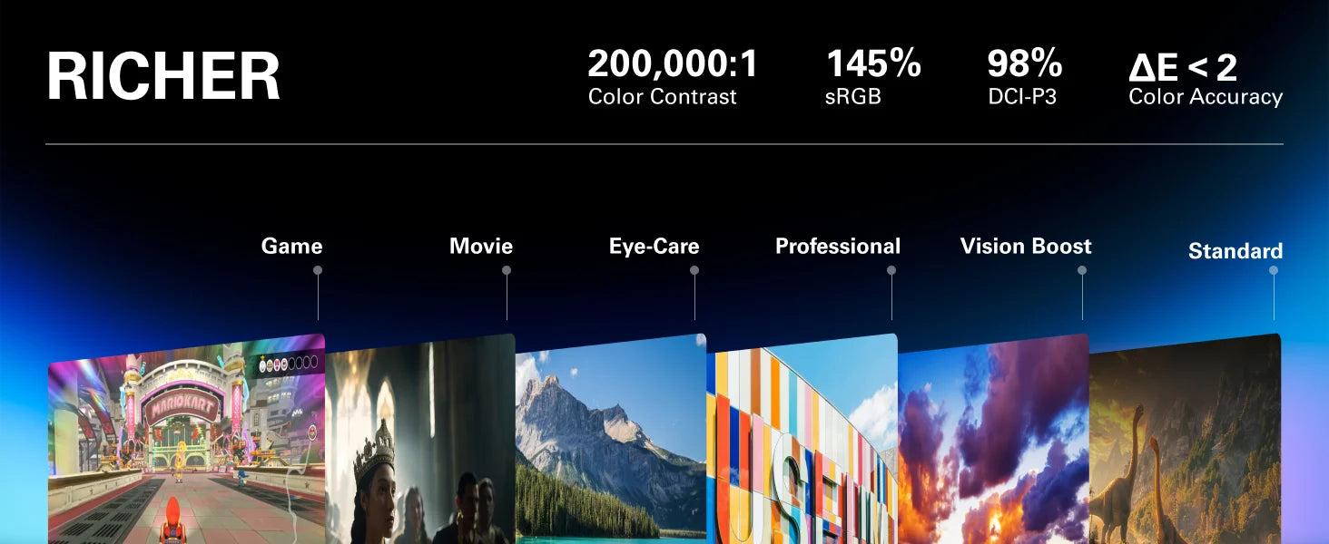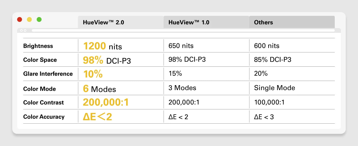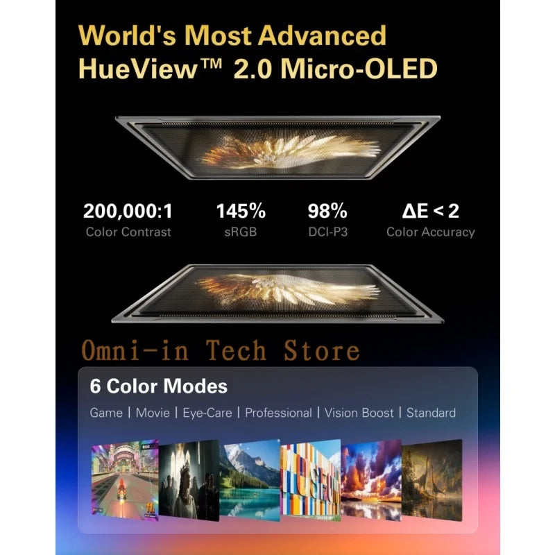 [HueView 2.0 - Leads Even Father in Micro-OLED Display] Combined with HueView 2.0 โ the 5.5th-gen tandem Micro-OLED display, youโll experience how 200,000:1 and 98% DCI-P3 shape you the most pure and lifelike visuals ever in wearable display glasses.