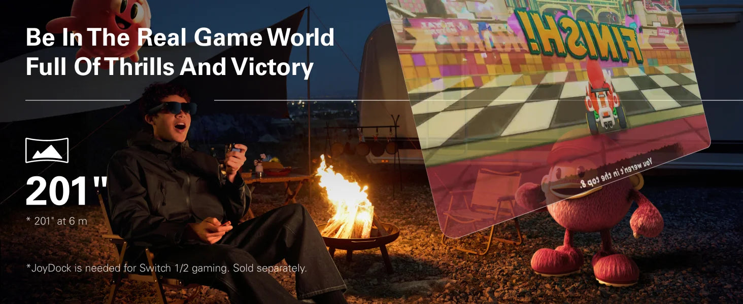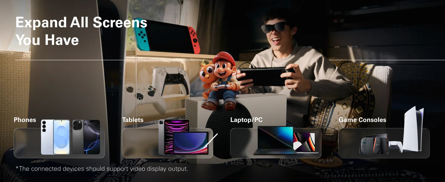 [Wide Compatibility โ Plug & Play Across Platforms] Connect instantly to iOS/Android (DisplayPort supported), Nintendo Switch/Switch 2 (via JoyDock), PCs/PS5/Xbox via HDMI to glasses and charging adapter, and more. Optional USB-C to glasses adapter is perfect for nonstop viewing or gaming. (*Accessories sold separately)