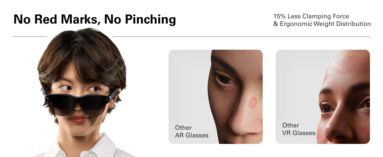 [Ultra-Light Comfort โ Fits Any Face, Any Time] Weighing just 76g, these AR video glasses feature a balanced 46.7%:53.3% weight distribution, adjustable temples (9 levels), and nose pads (3 levels) to fit most global head shapes.
