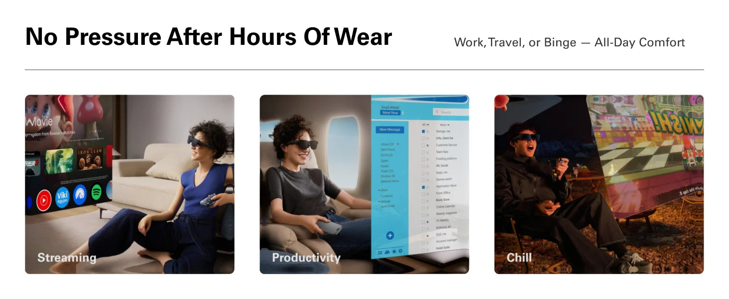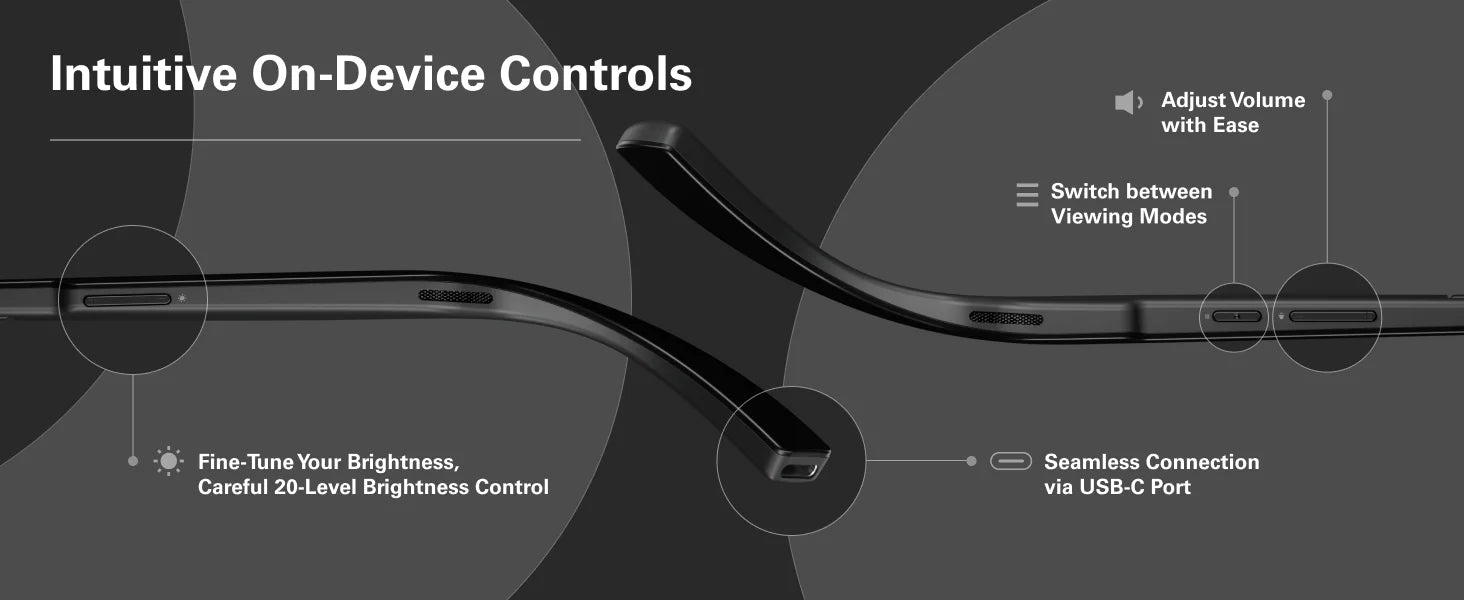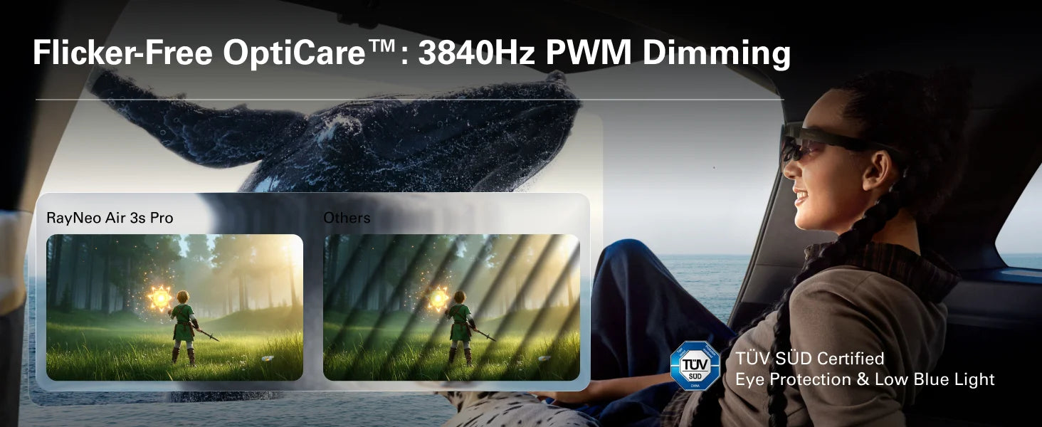 [Eye Comfort Certified โ Binge Without Strain] The only wearable display glasses with TรV SรD Low Blue Light & Flicker-Free dual certification, 3,840Hz high-frequency PWM dimming, and 20-level brightness control. Enjoy hours of content with reduced eye fatigue.
