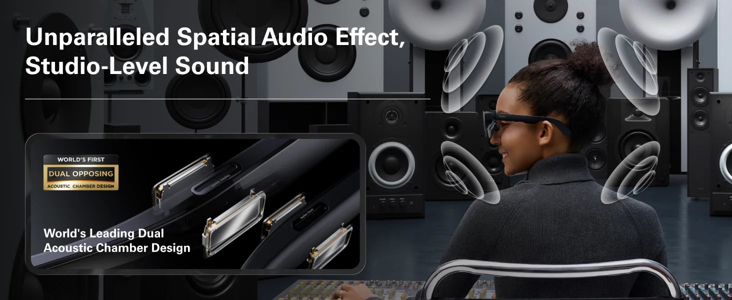 [Immersive Audio โ Whisper Mode Privacy Sound] Self-developed quad-speaker system with spatial audio algorithms delivers theater-grade surround sound that follows your head movement. Whisper Mode focuses audio directly to your ears for private listening.