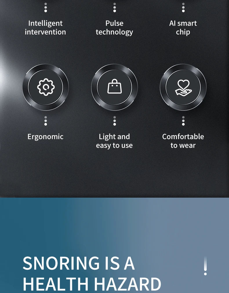 Wear the product during rest, the product will automatically and accurately detect snoring through high-precision sensors, massage the hypoglossal nerve and mandibular muscles through vibration pulses of different frequencies, promote muscle tightening, adjust breathing rhythm, and make breathing easier