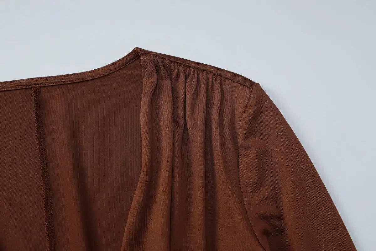Women's Clothing 2025 Autumn Solid Color Long-sleeved Deep V-neck Fashion Pleated Slim-fit Jumpsuit