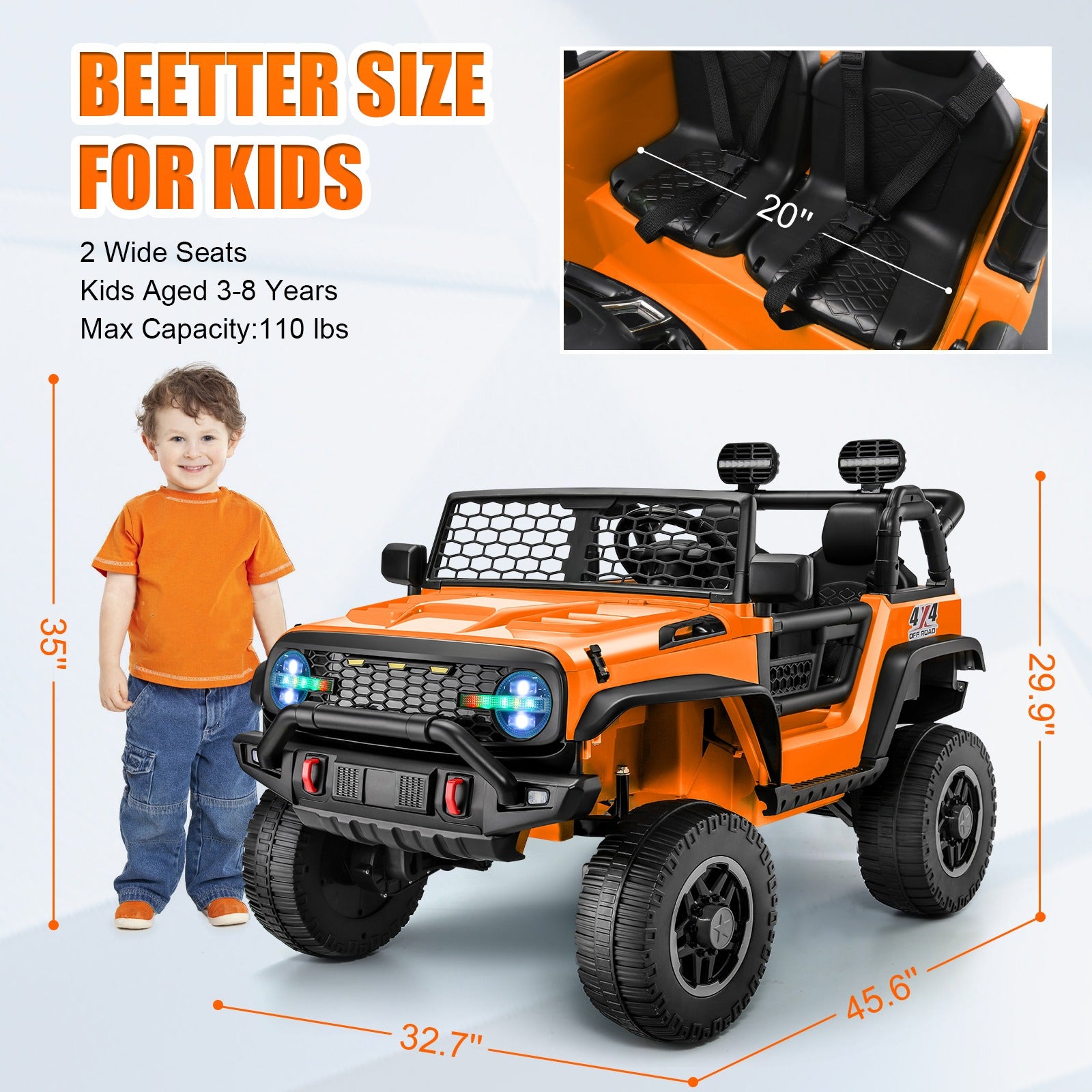 · 【Comfortable 2-Seater Design】This dual-motor electric ride-on car accommodates two children, with a maximum weight capacity of 110 lbs. This car is suitable for one child aged 3-10 years old or two children aged 3-6 years old under adult supervision.